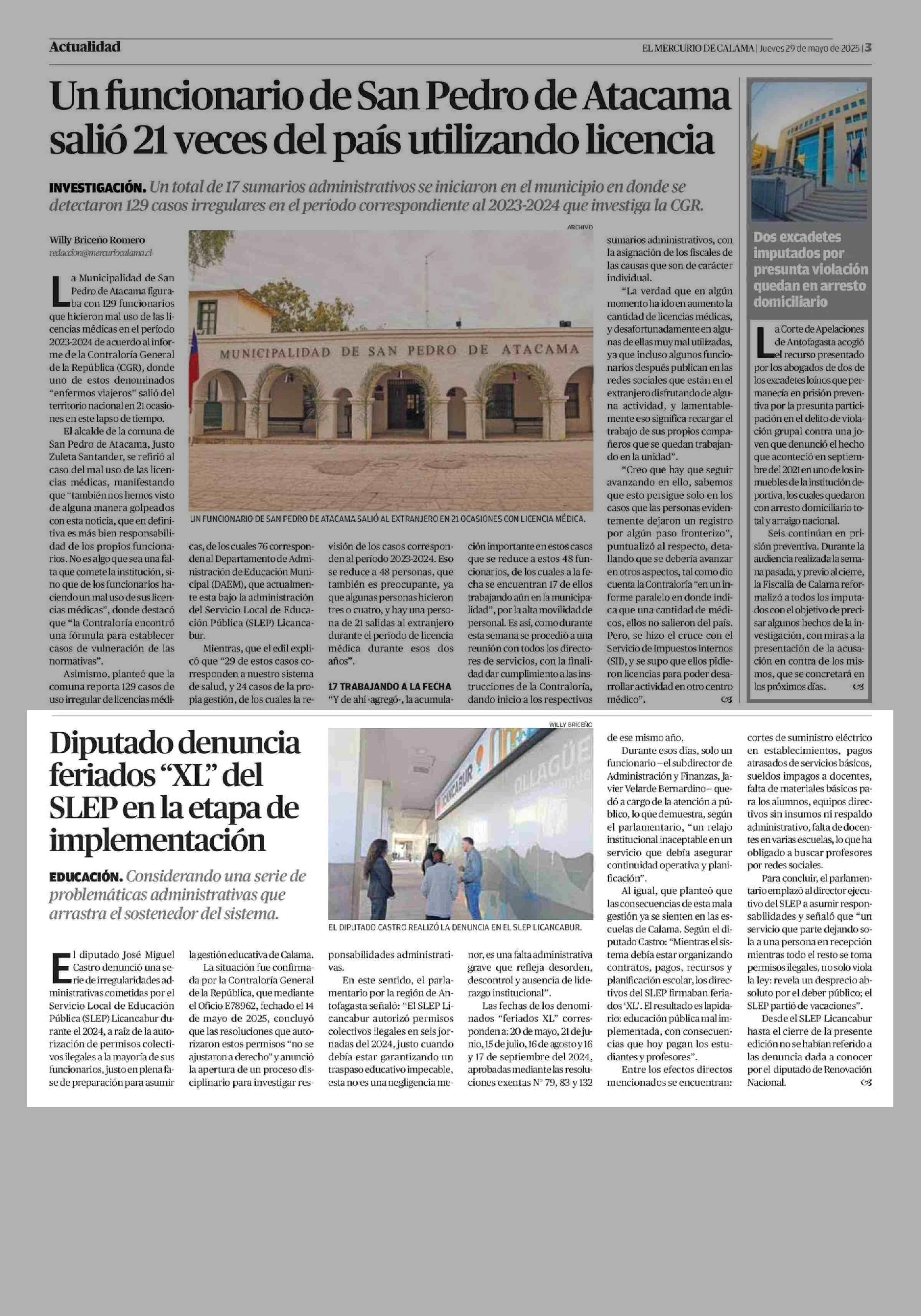 Diputado denuncia feriados “XL” del SLEP en la etapa de implementación 29-05-2025 El Mercurio de Calama |