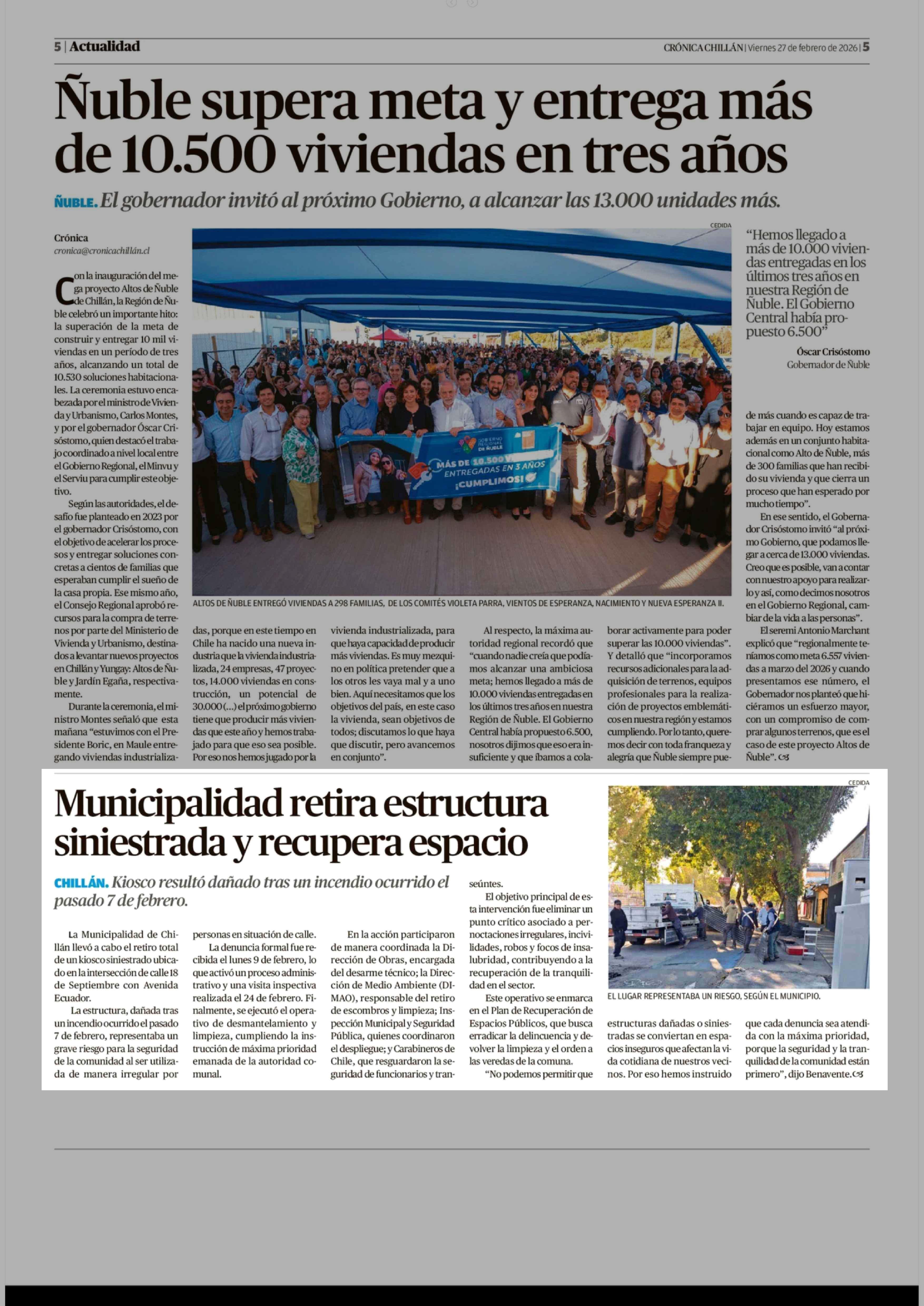 Municipalidad retira estructura siniestrada y recupera espacio 27-02-2026 Crónica de Chillán |