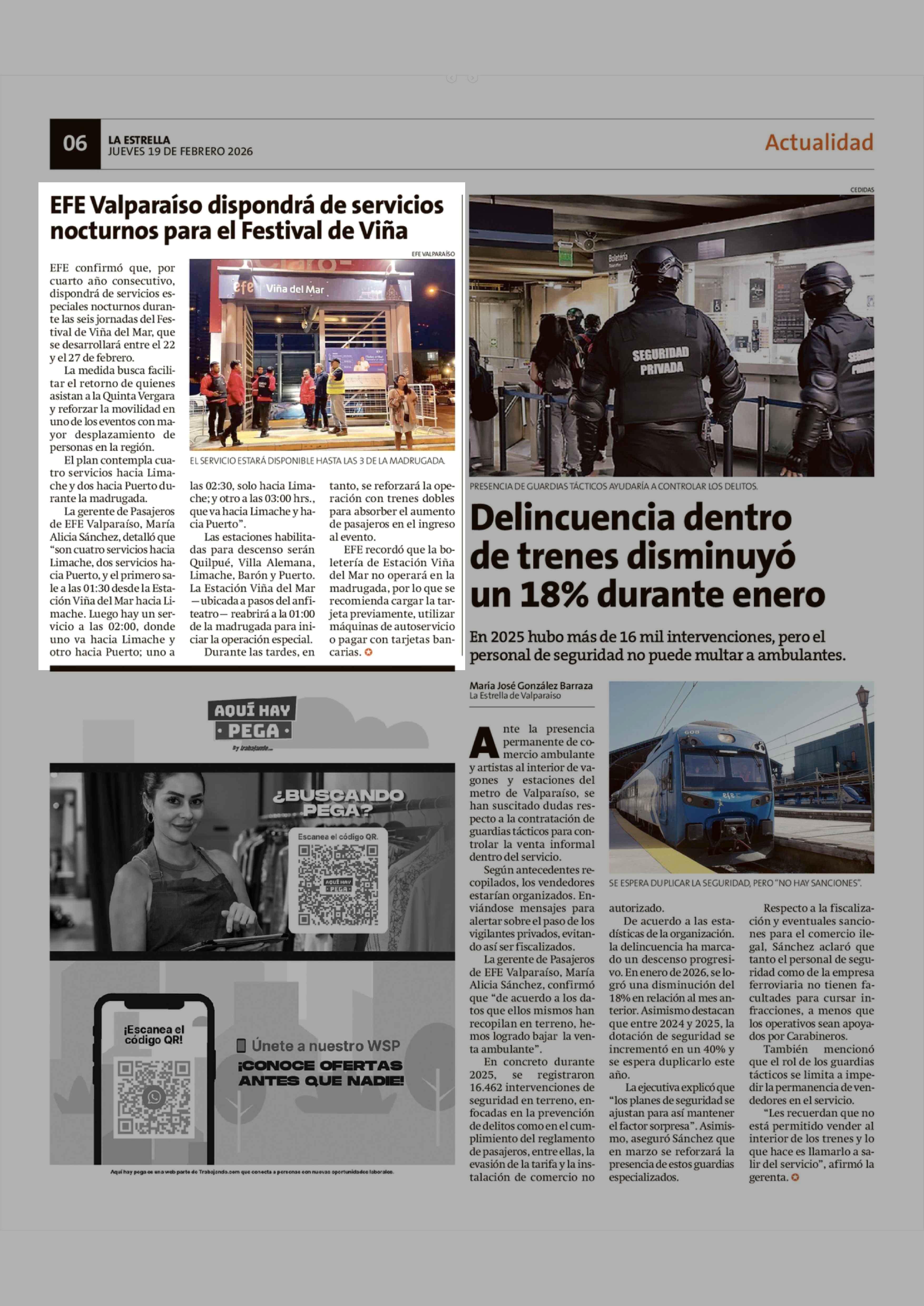 EFE Valparaíso dispondrá de servicios nocturnos para el Festival de Viña 19-02-2026 La Estrella de Valparaíso |