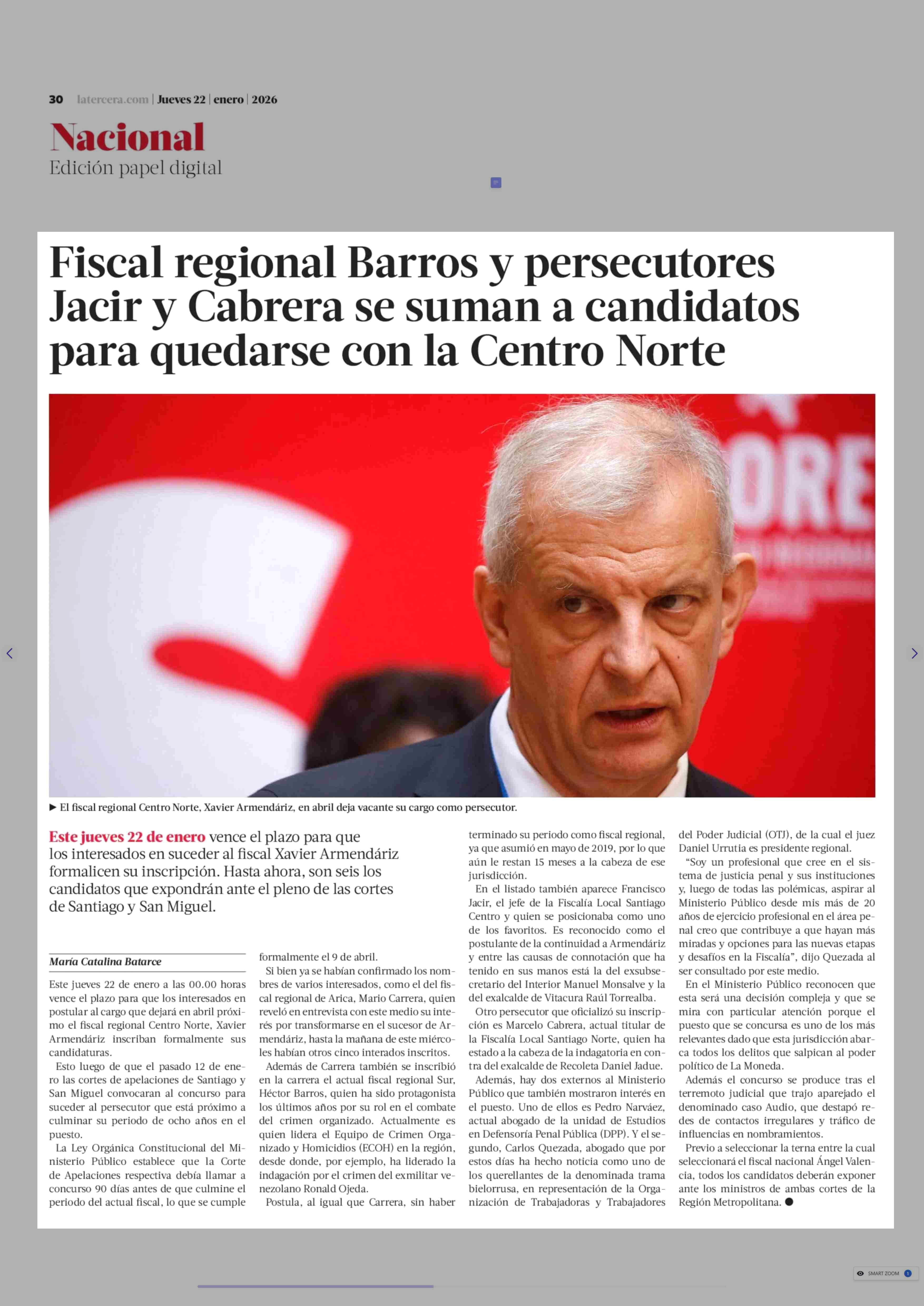 Fiscal regional Barros y persecutores Jacir y Cabrera se suman a candidatos para quedarse con la Centro Norte 22-01-2026 La Tercera |