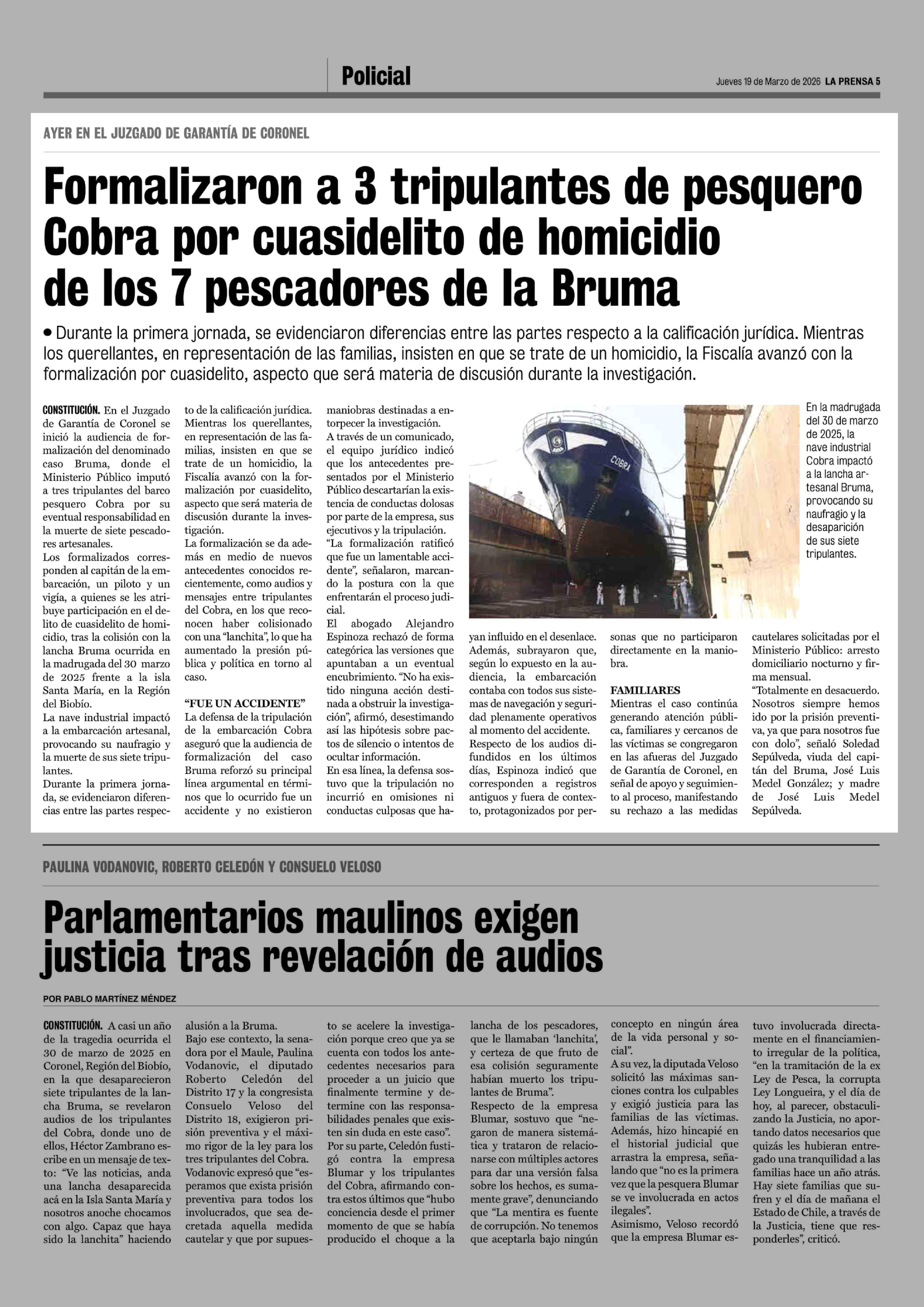Formalizaron a 3 tripulantes de pesquero Cobra por cuasidelito de homicidio de los 7 pescadores de la Bruma 19-03-2026 La Prensa de Curicó |