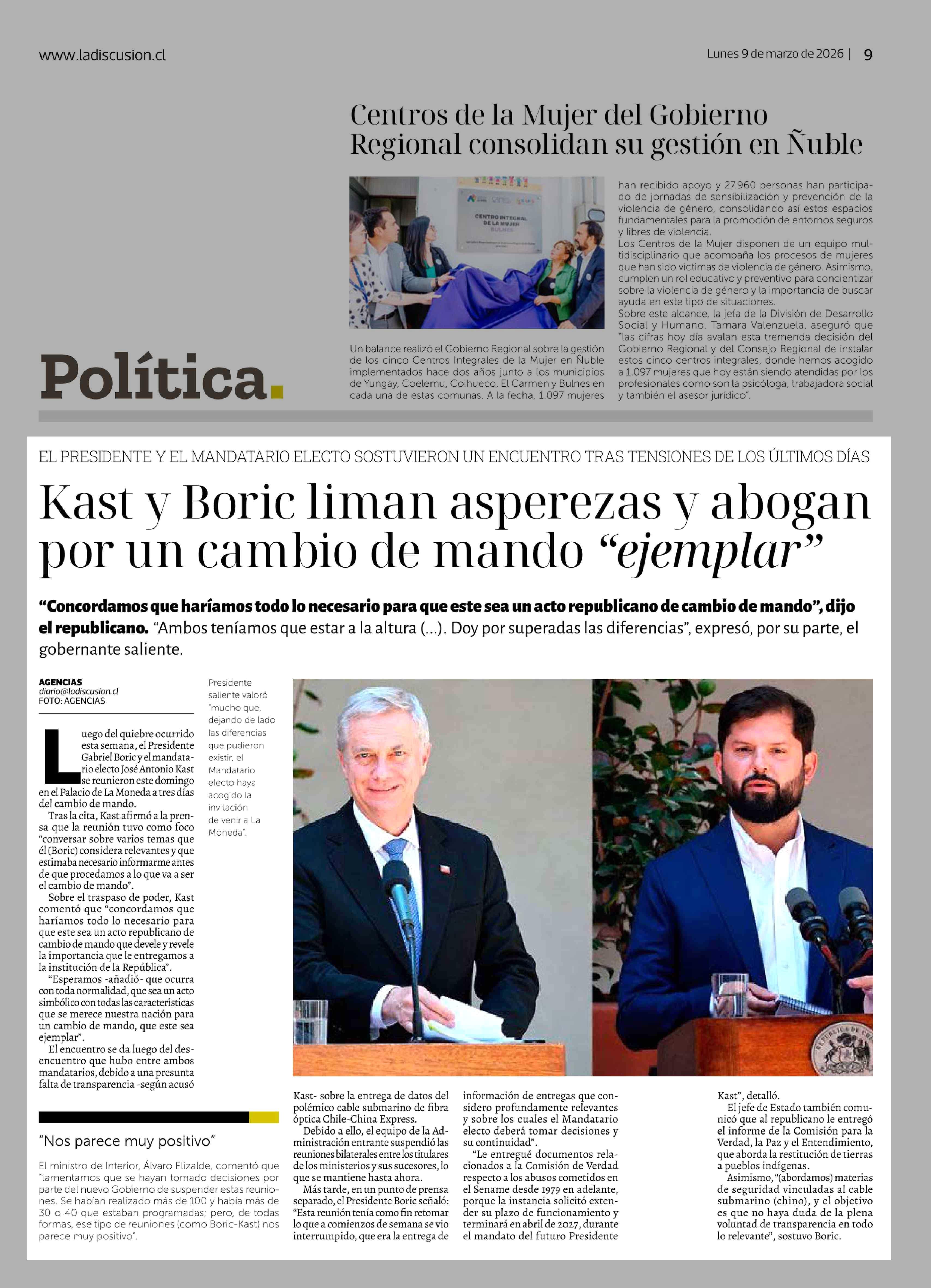 Kast y Boric liman asperezas y abogan por un cambio de mando "ejemplar" 09-03-2026 La Discusión |