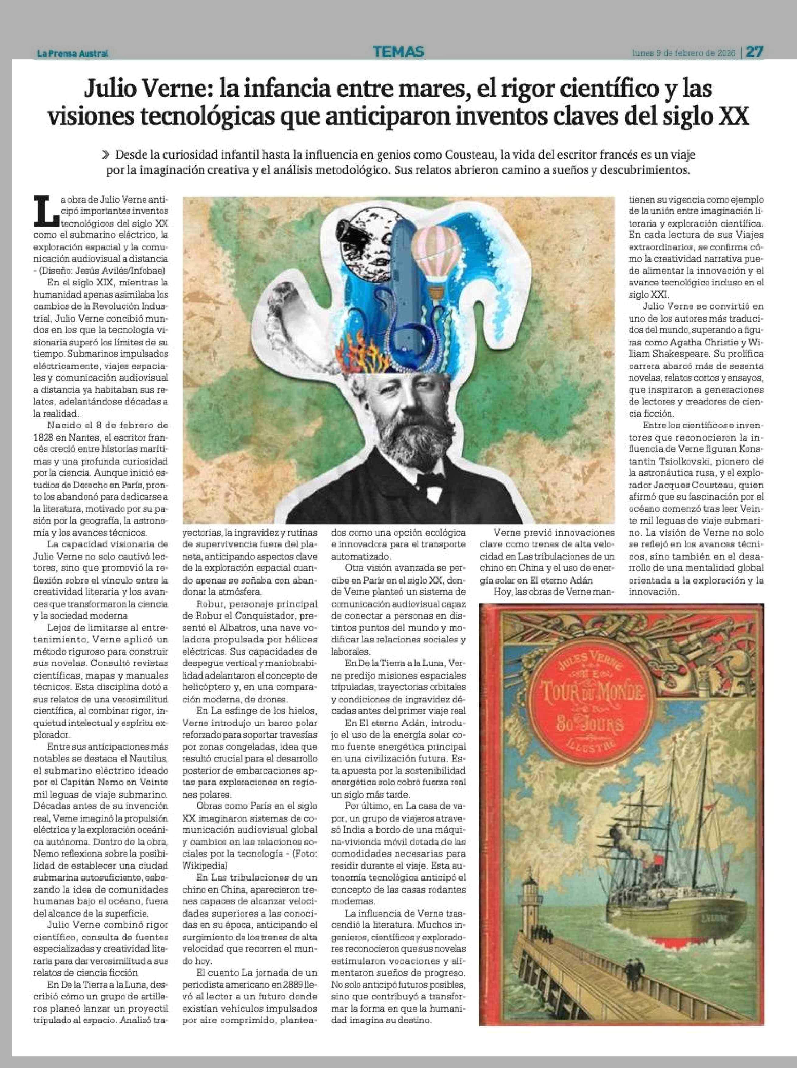 Julio Verne: la infancia entre mares, el rigor científico y las visiones tecnológicas que anticiparon inventos claves del siglo XX 09-02-2026 La Prensa Austral |