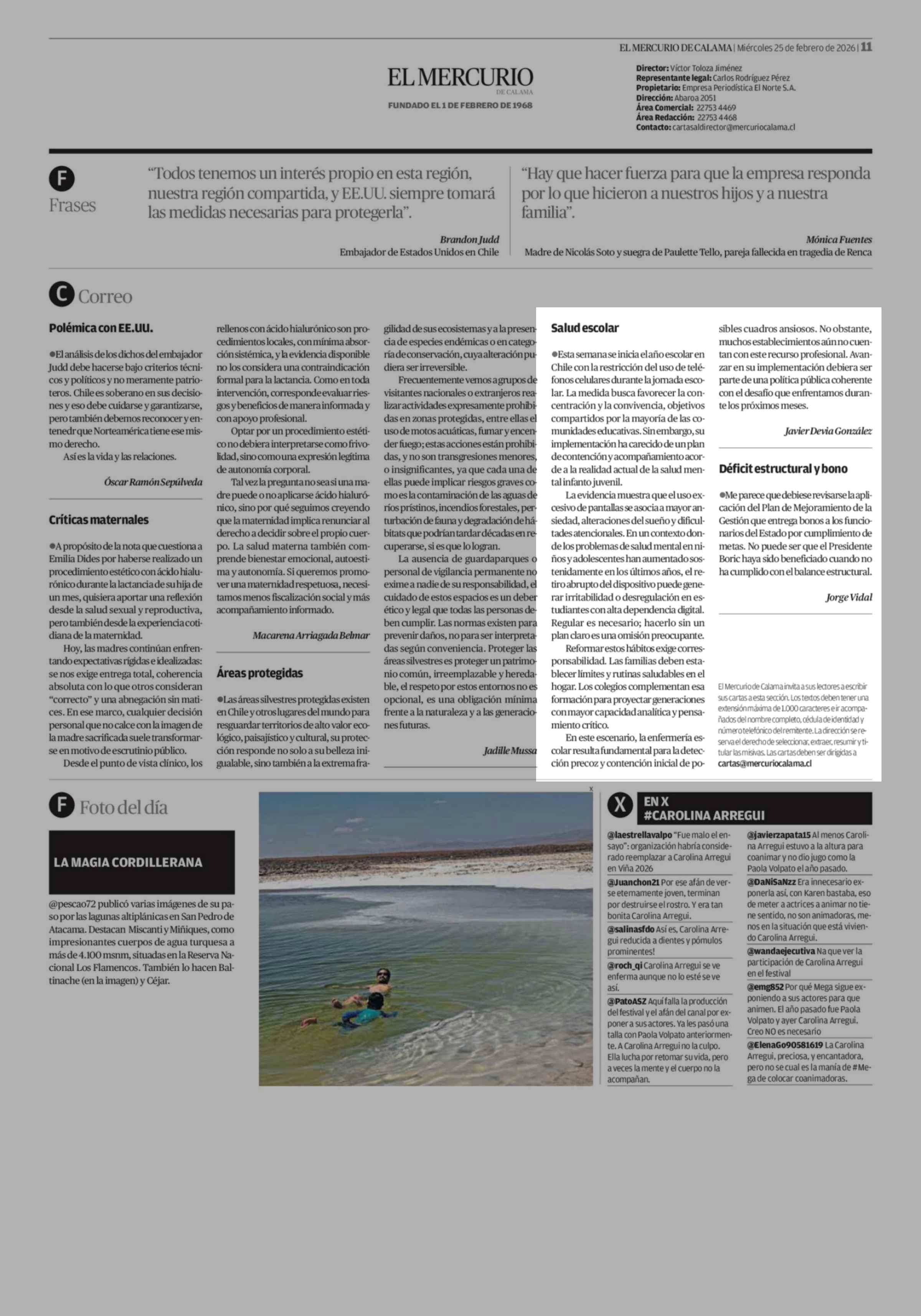 Cartas: Salud escolar 25-02-2026 El Mercurio de Calama |