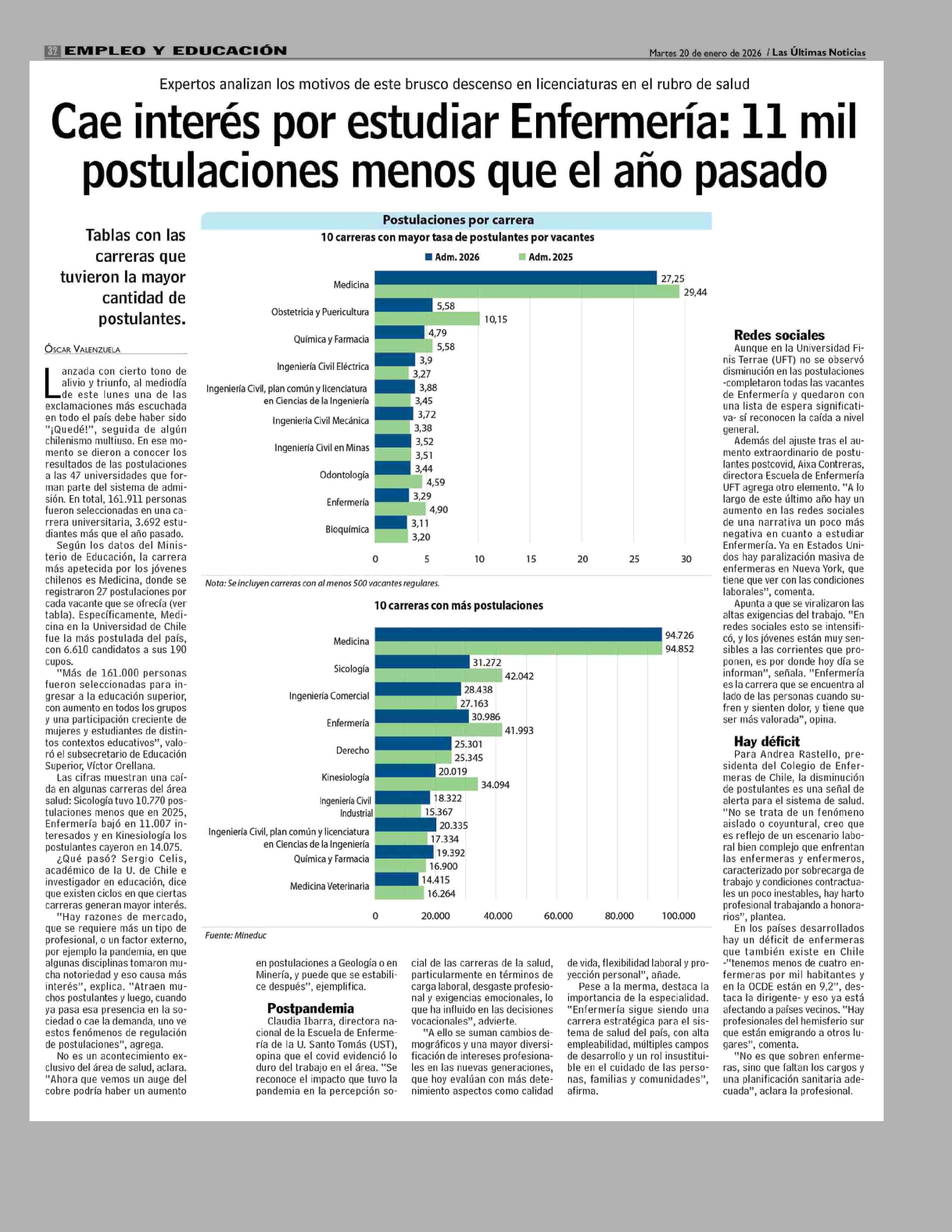 Cae interés por estudiar Enfermería: 11 mil postulaciones menos que el año pasado 20-01-2026 Las Últimas Noticias |