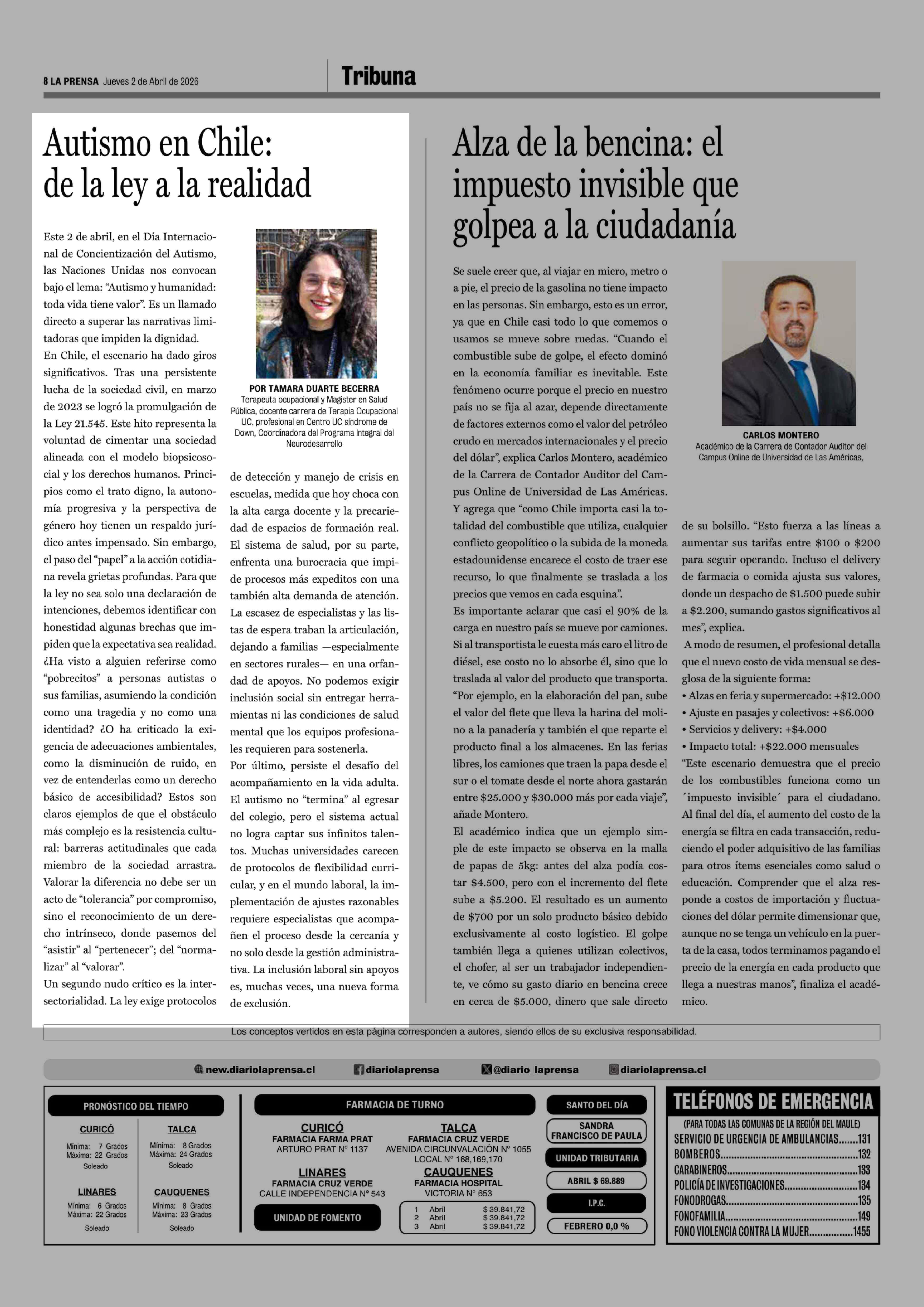 Columnas de Opinión: Autismo en Chile: de la ley a la realidad 02-04-2026 La Prensa de Curicó |