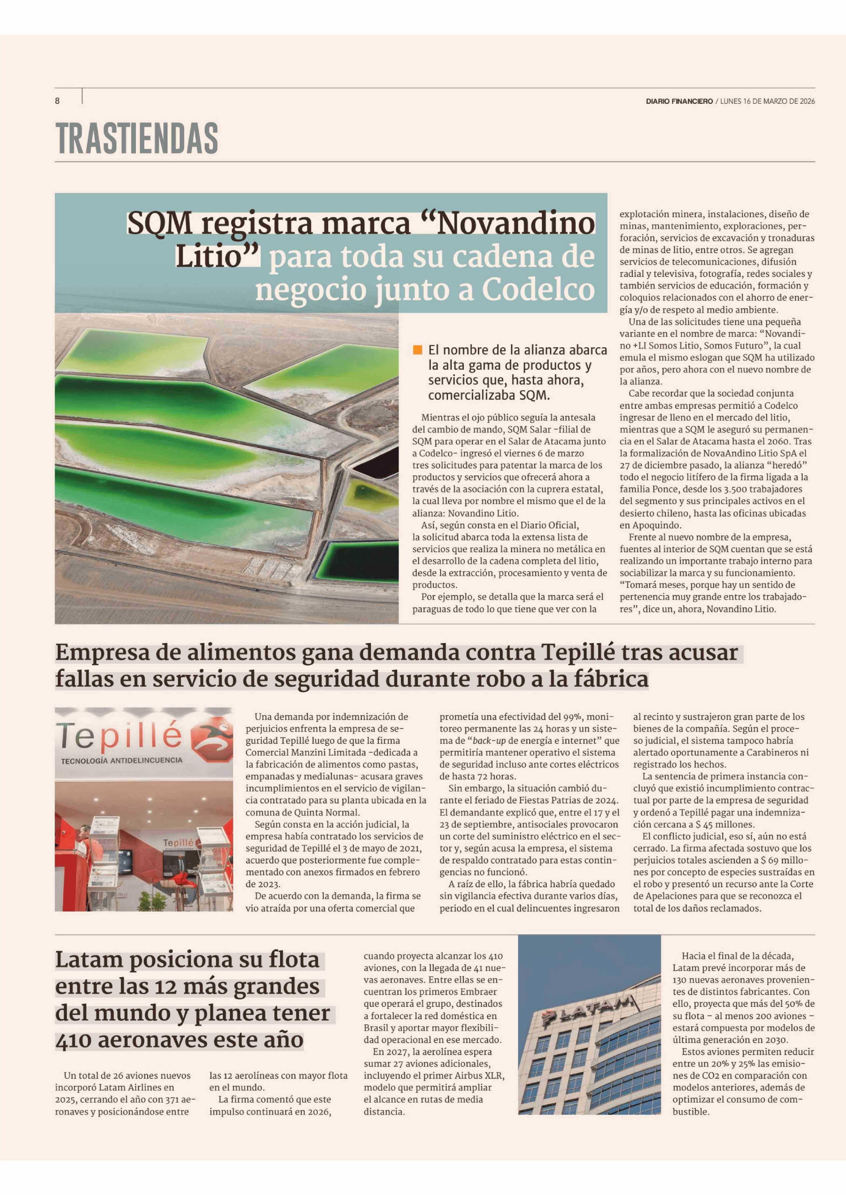 SQM registra marca "Novandino Litio" para toda su cadena de negocio junto a Codelco 16-03-2026 Diario Financiero |
