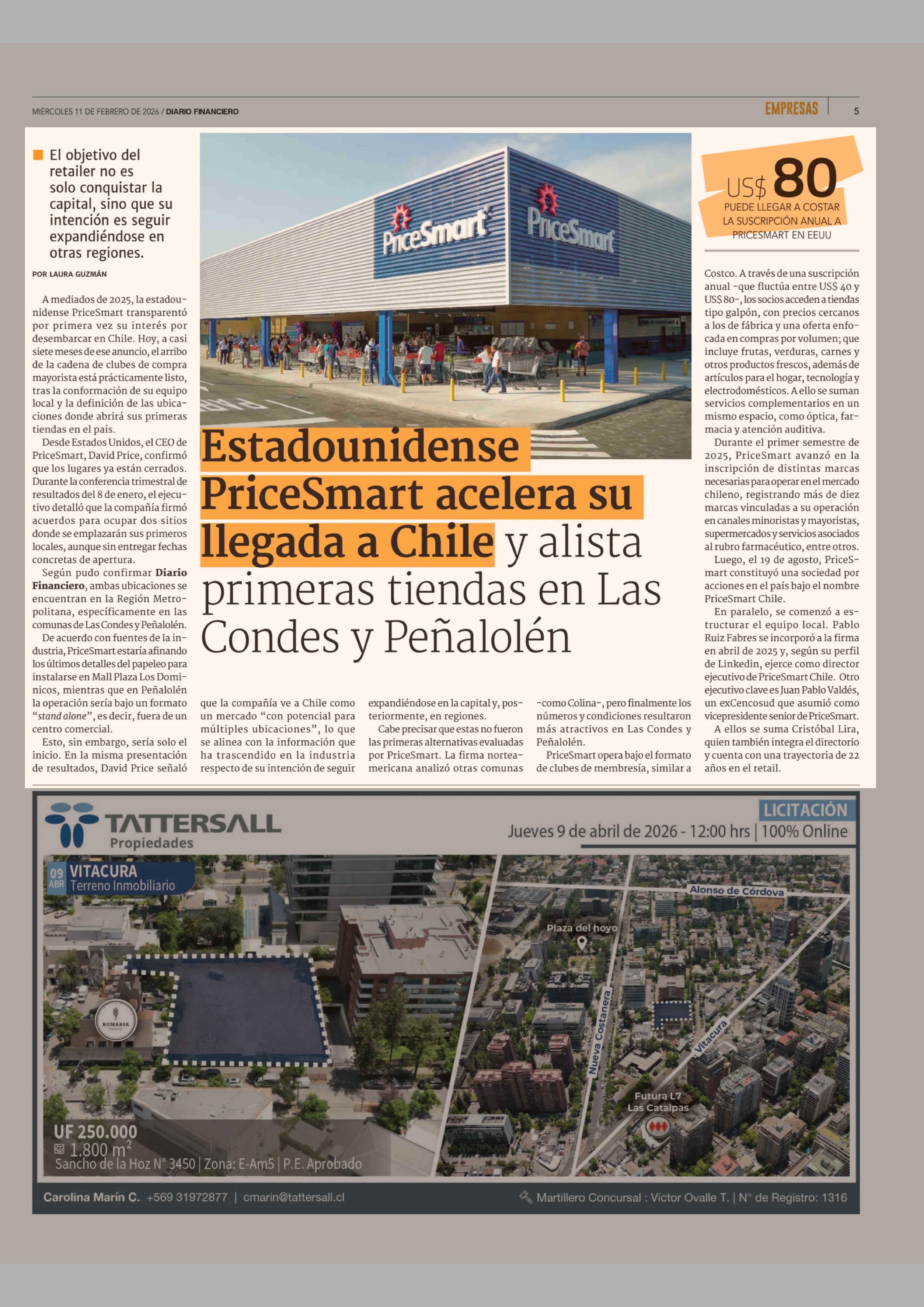 Estadounidense PriceSmart acelera su llegada a Chile y alista primeras tiendas en Las Condes y Peñalolén 11-02-2026 Diario Financiero |