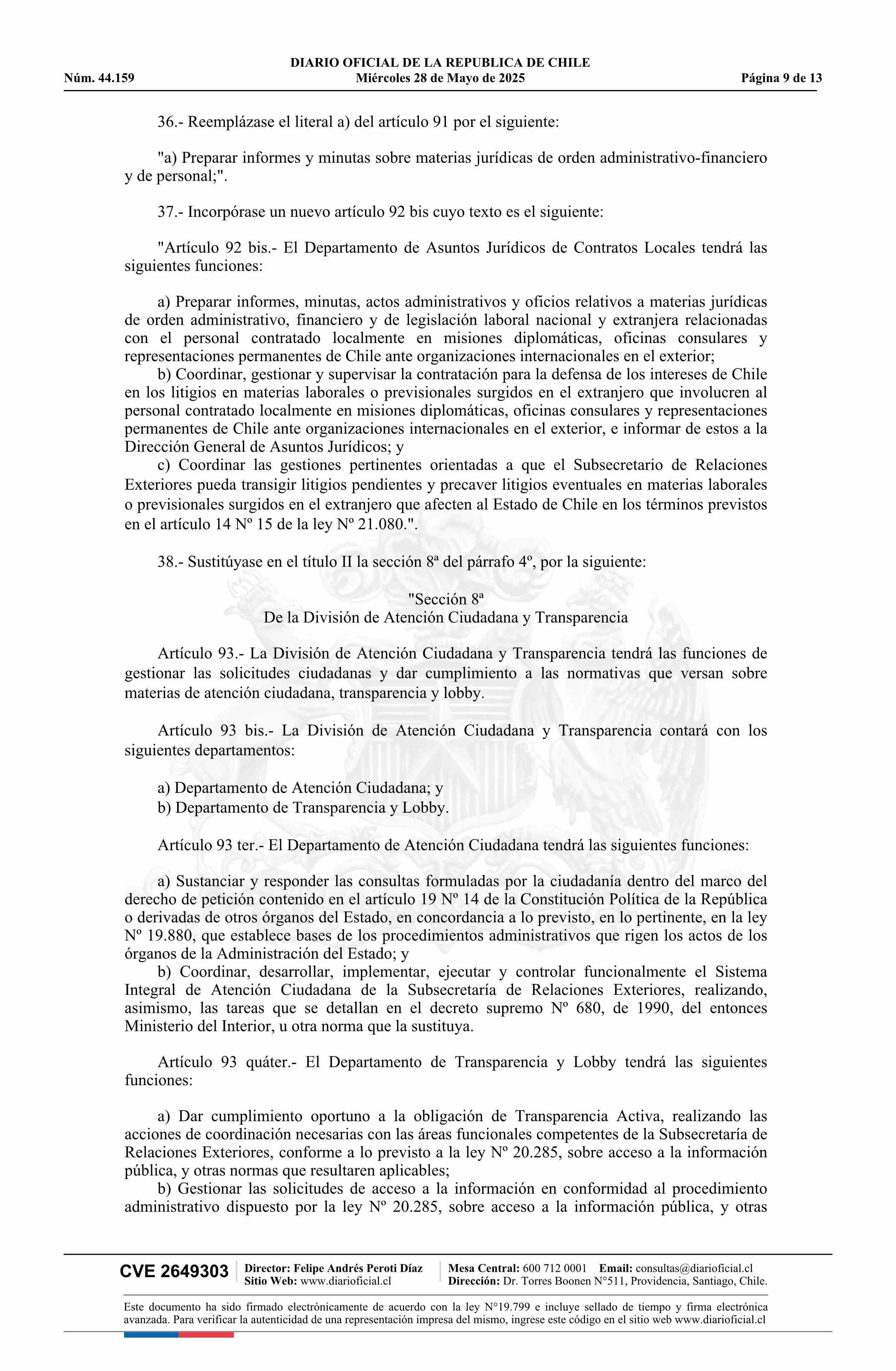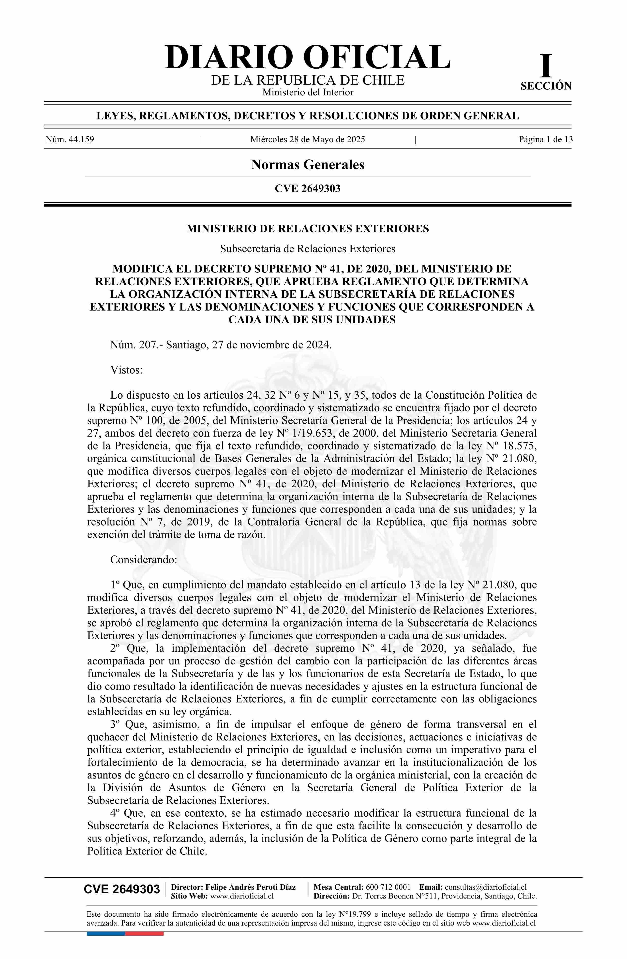 Decreto número 207, de 2024.- Modifica el decreto Nº 41, de 2020, que aprueba Reglamento que determina la organización interna de la Subsecretaría de Relaciones Exteriores y las denominaciones y funciones que corresponden a cada una de sus unidades