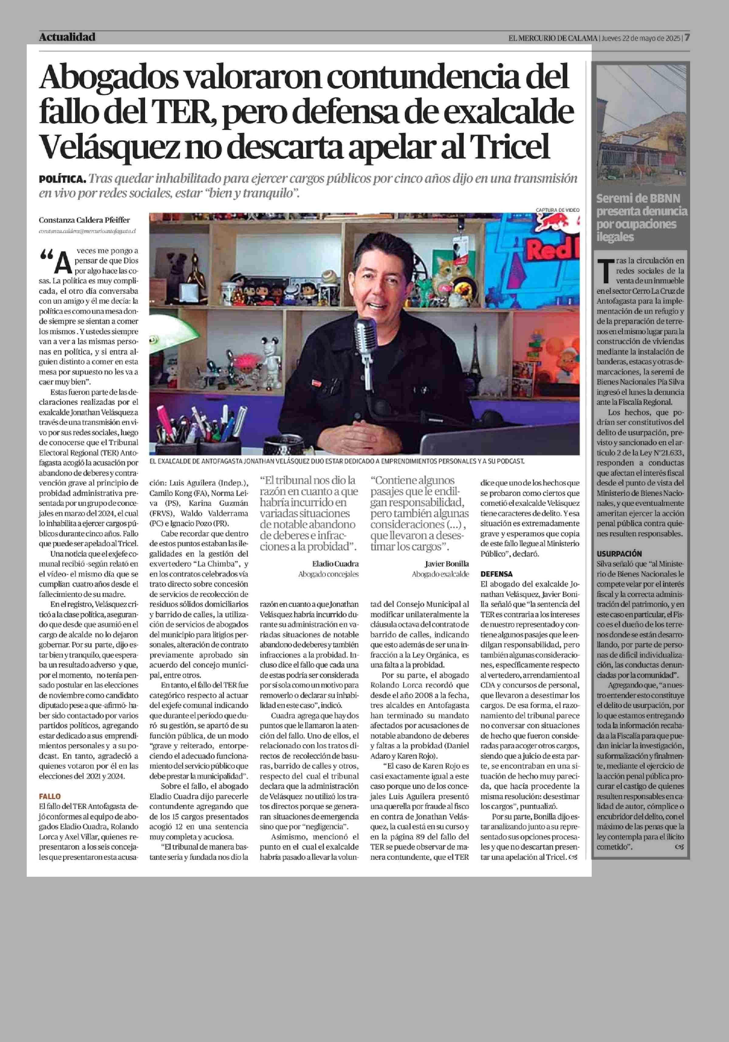 Abogados valoraron contundencia del fallo del TER, pero defensa de exalcalde Velásquez no descarta apelar al Tricel 22-05-2025 El Mercurio de Calama |