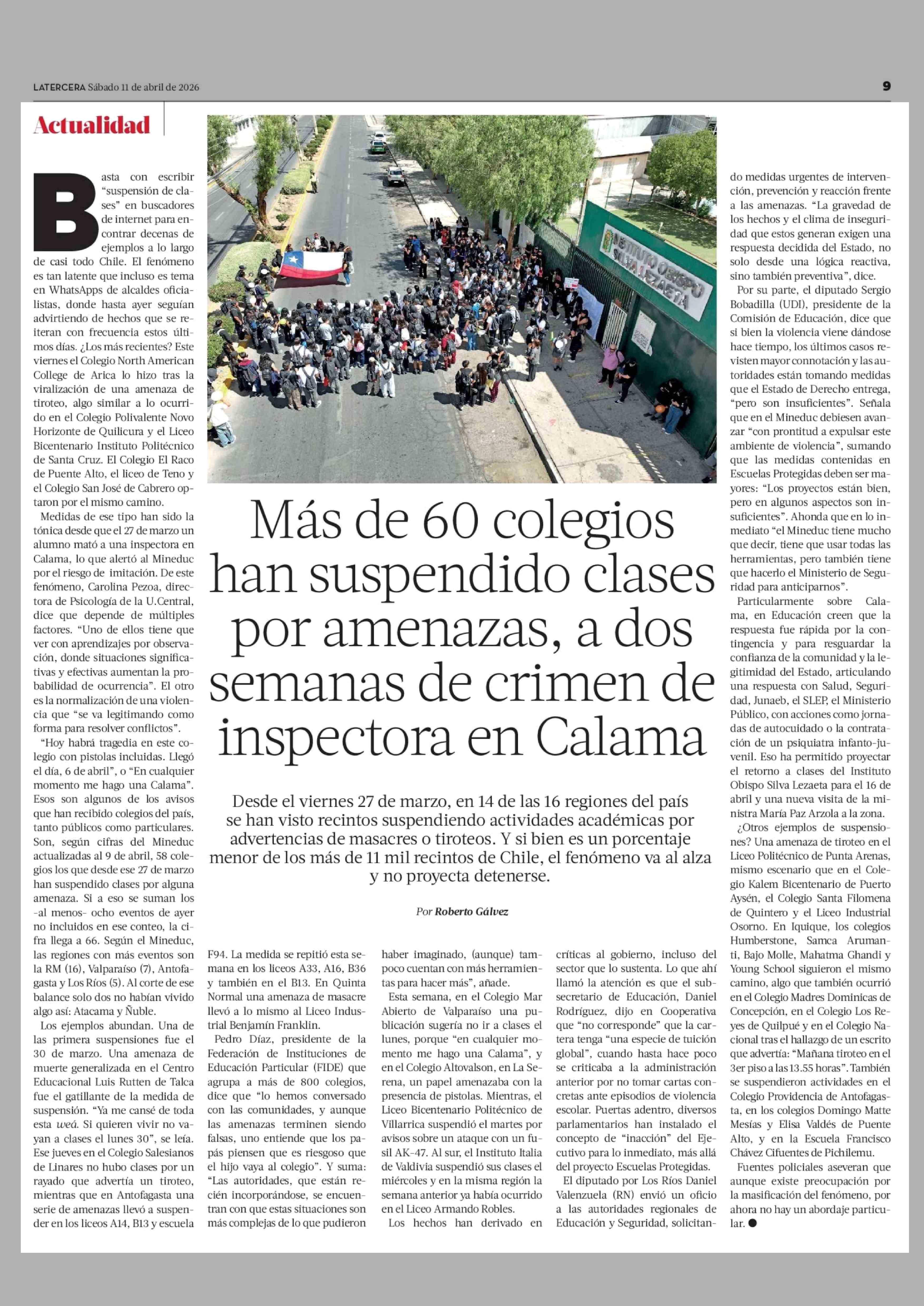 Título: Más de 60 colegios han suspendido clases por amenazas, a dos semanas de crimen de inspectora en Calama