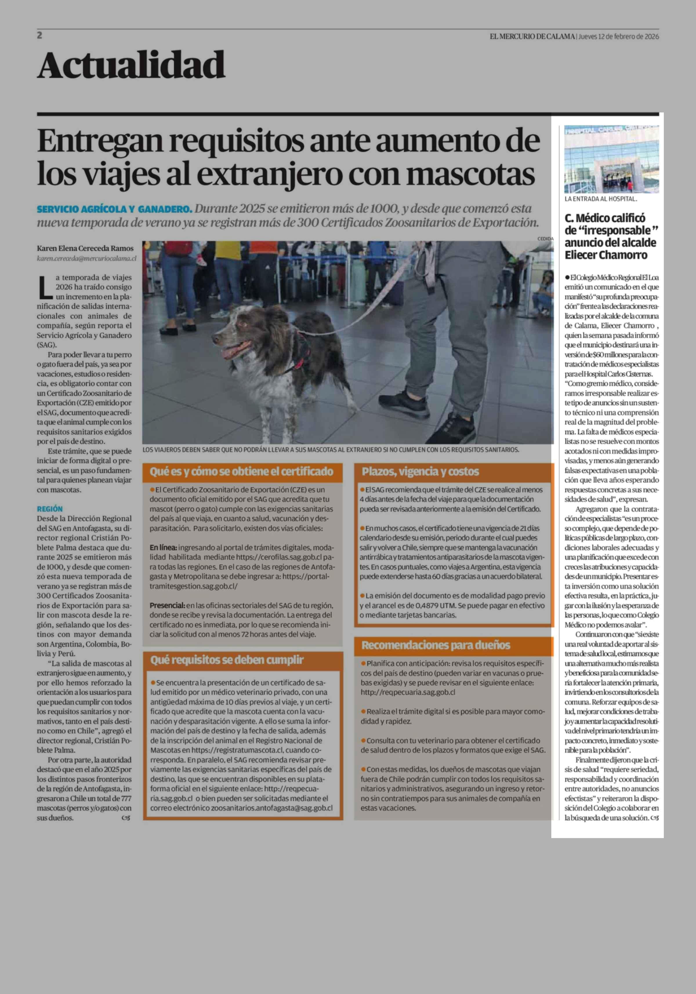 C. Médico calificó de "irresponsable" anuncio del alcalde Eliecer Chamorro 12-02-2026 El Mercurio de Calama |
