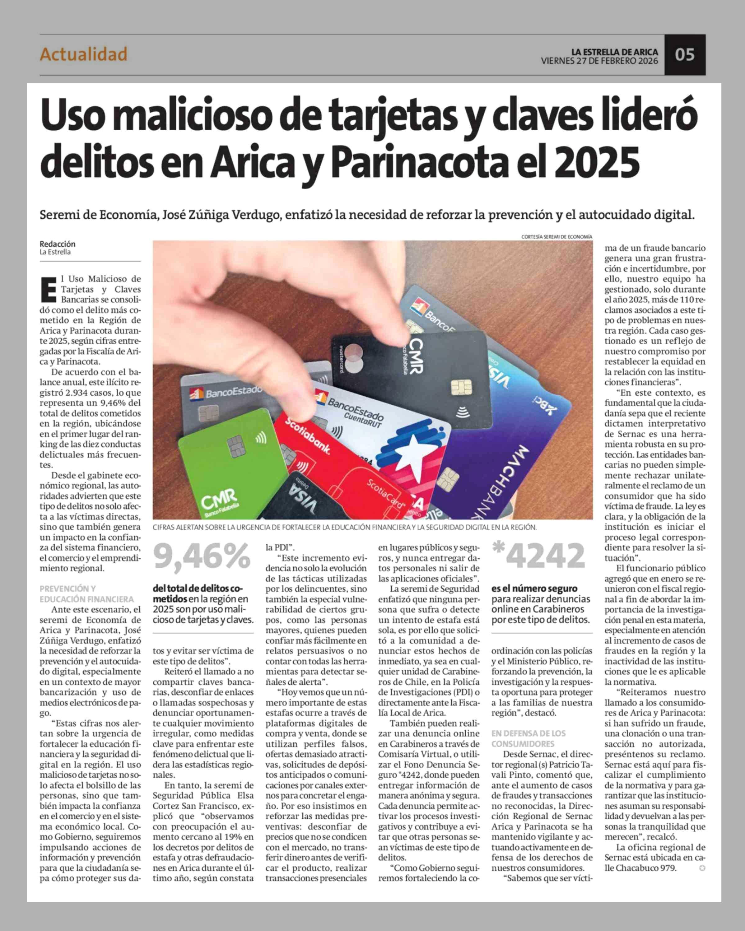 Título: Uso malicioso de tarjetas y claves lideró delitos en Arica y Parinacota el 2025