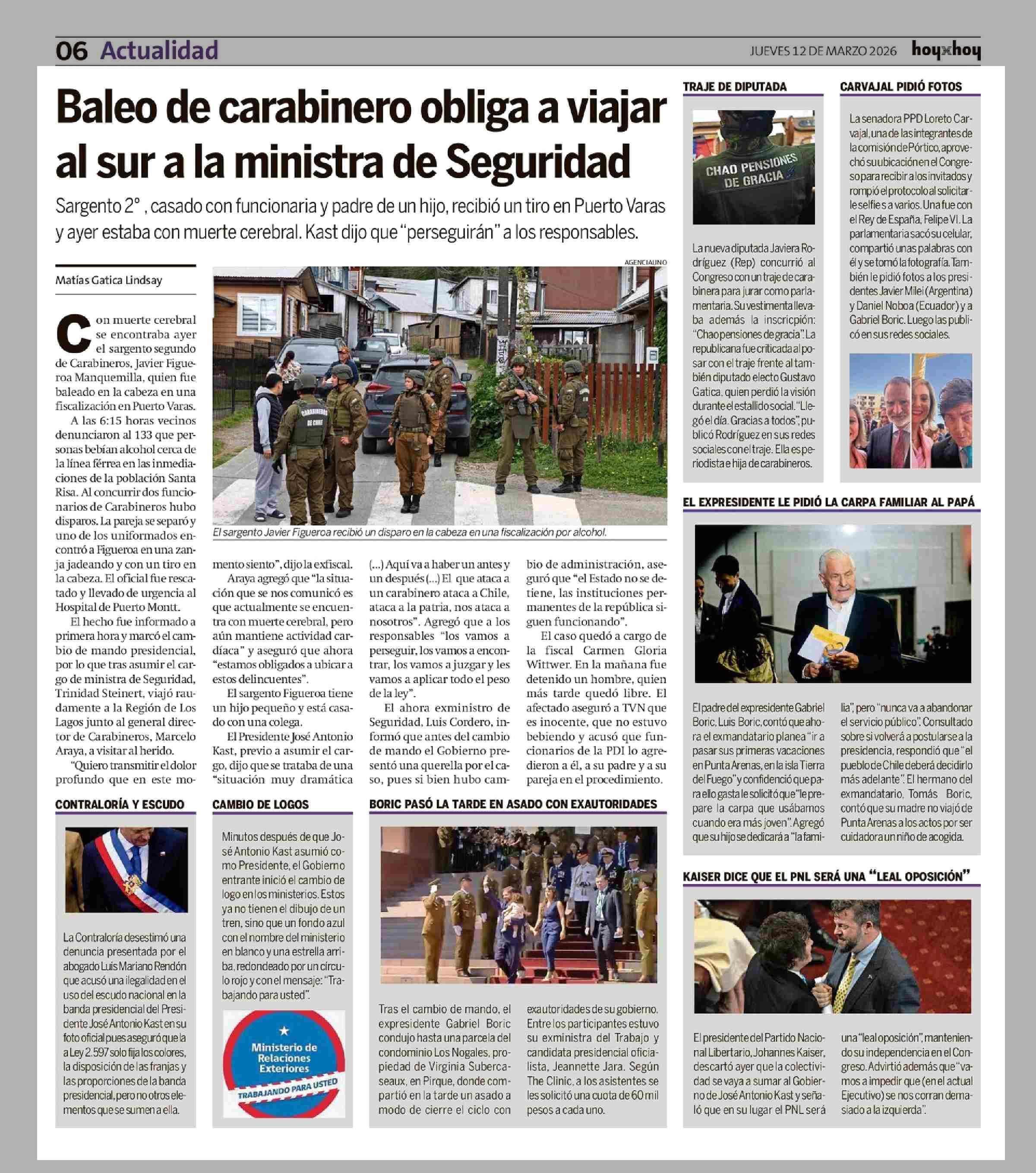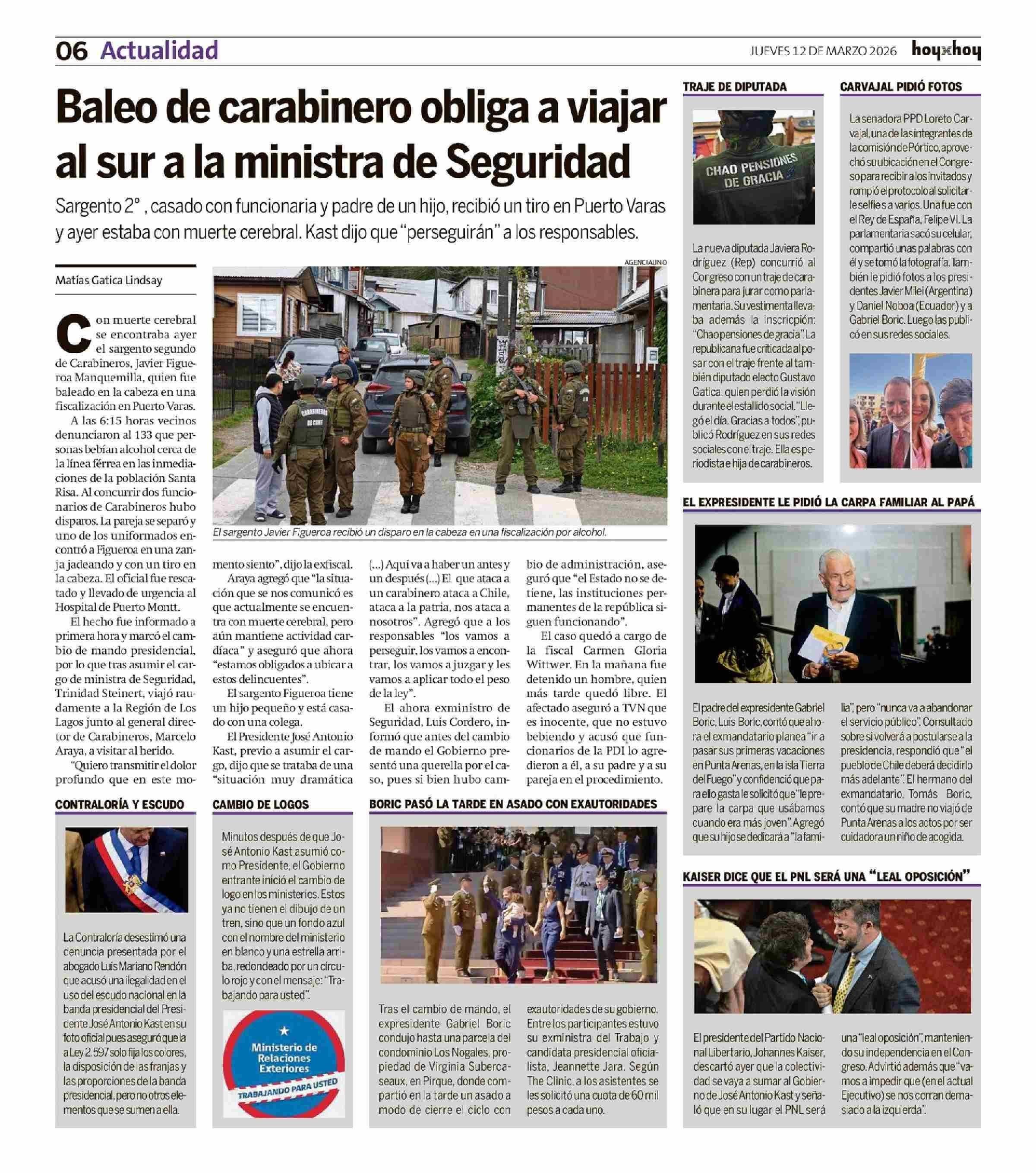 Baleo de carabinero obliga a viajar al sur a la ministra de Seguridad 12-03-2026 Hoy x Hoy |