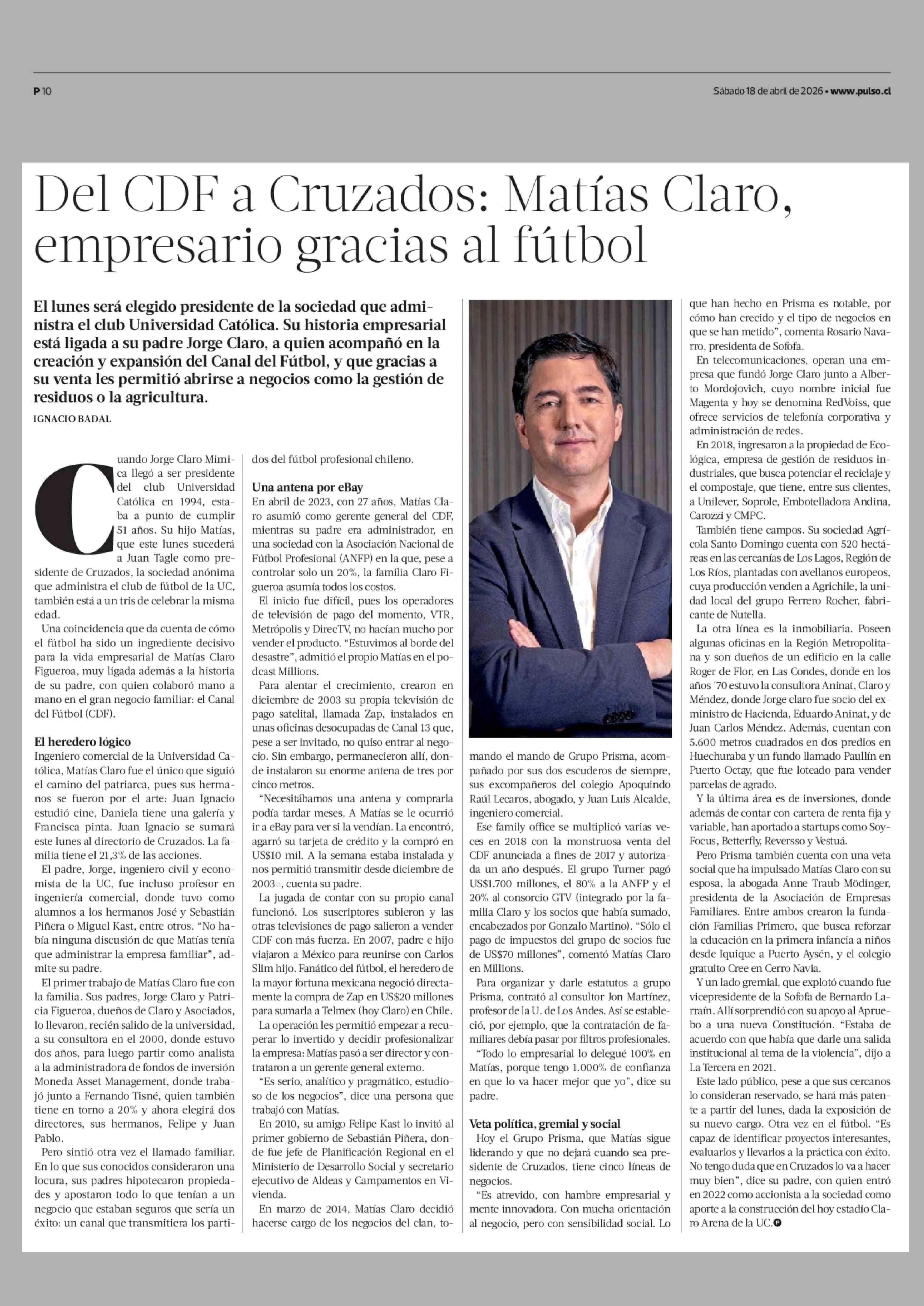 Del CDF a Cruzados: Matías Claro, empresario gracias al fútbol 18-04-2026 La Tercera |