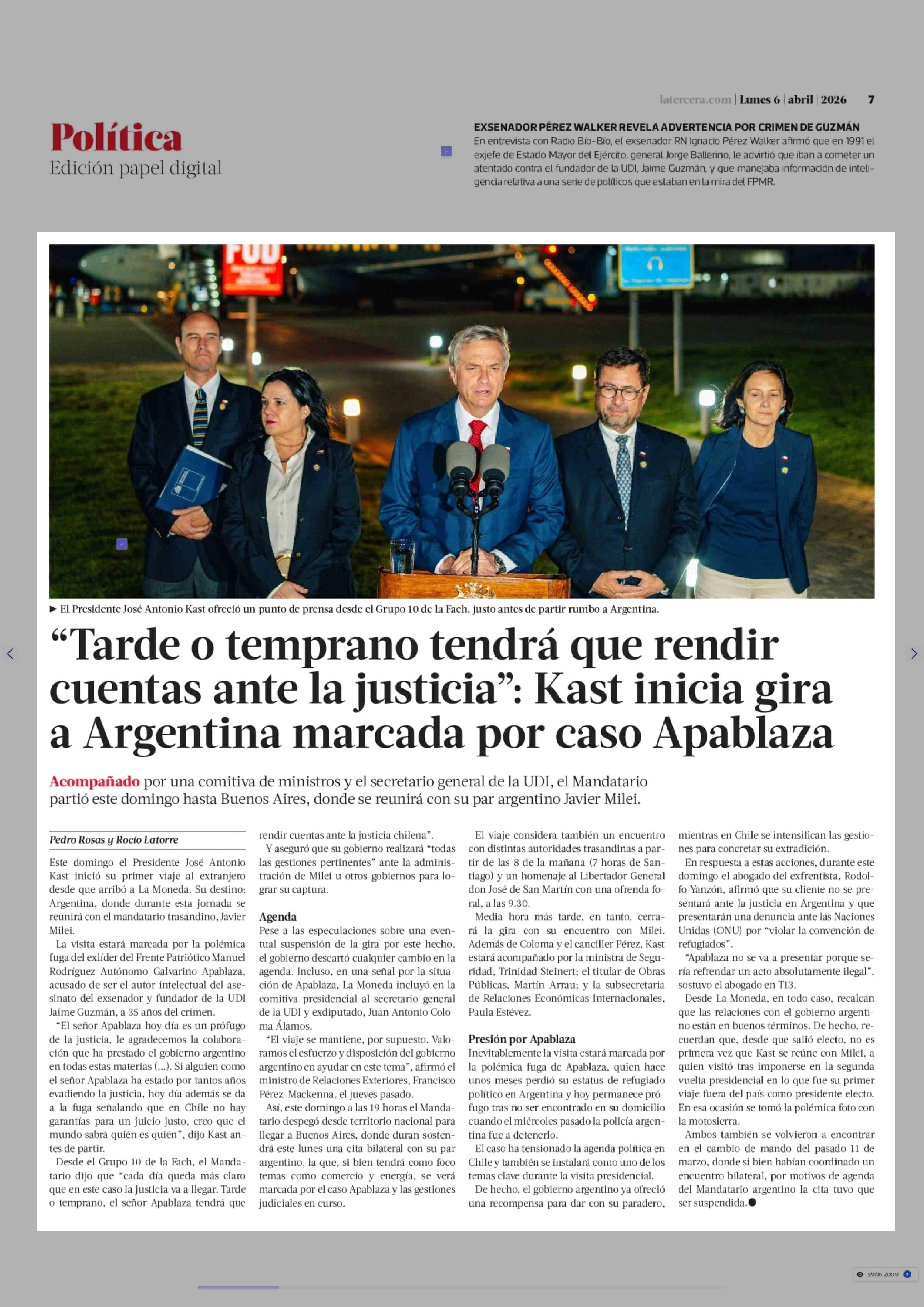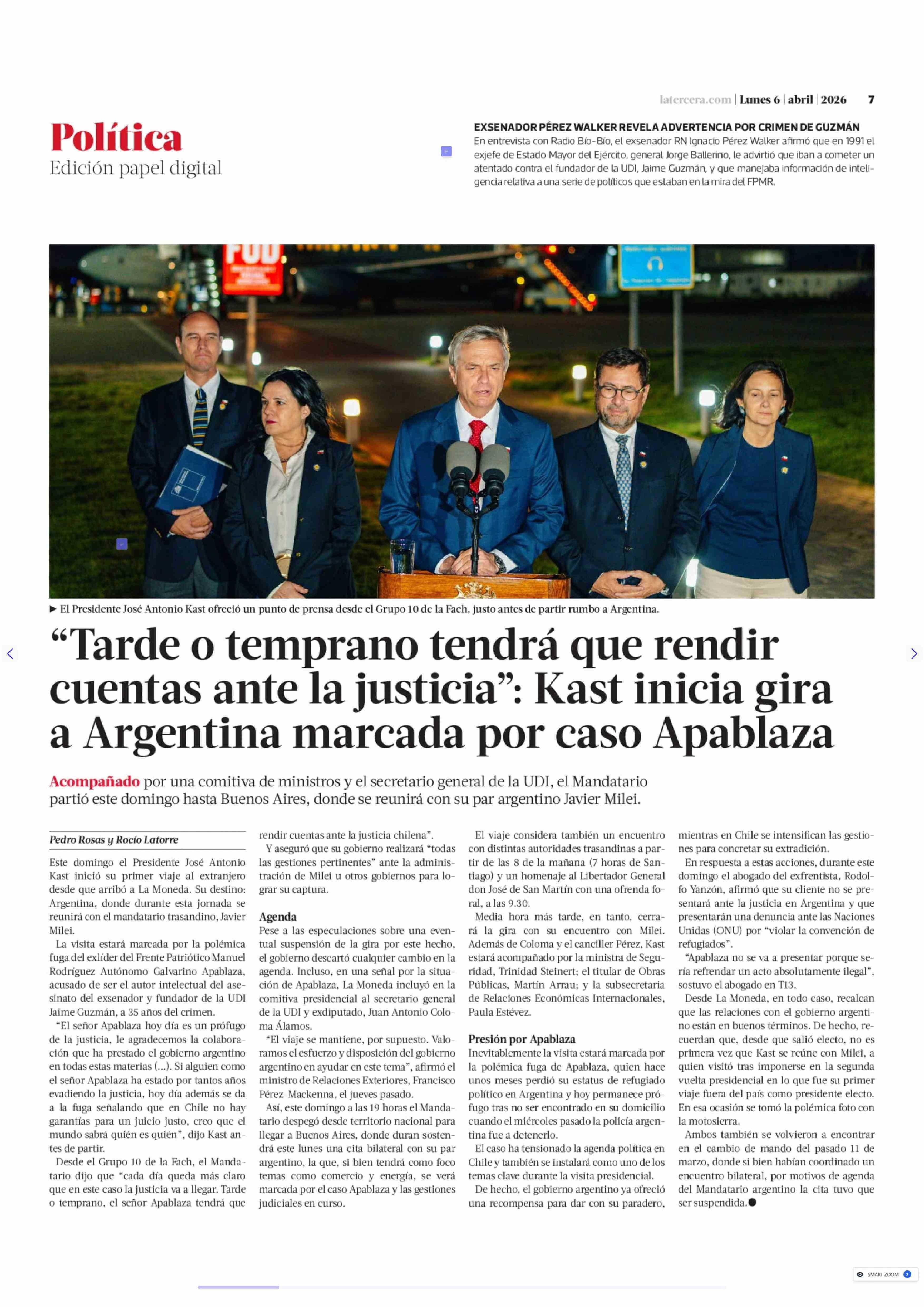 Título: "Tarde o temprano tendrá que rendir cuentas ante la justicia": Kast inicia gira a Argentina marcada por caso Apablaza