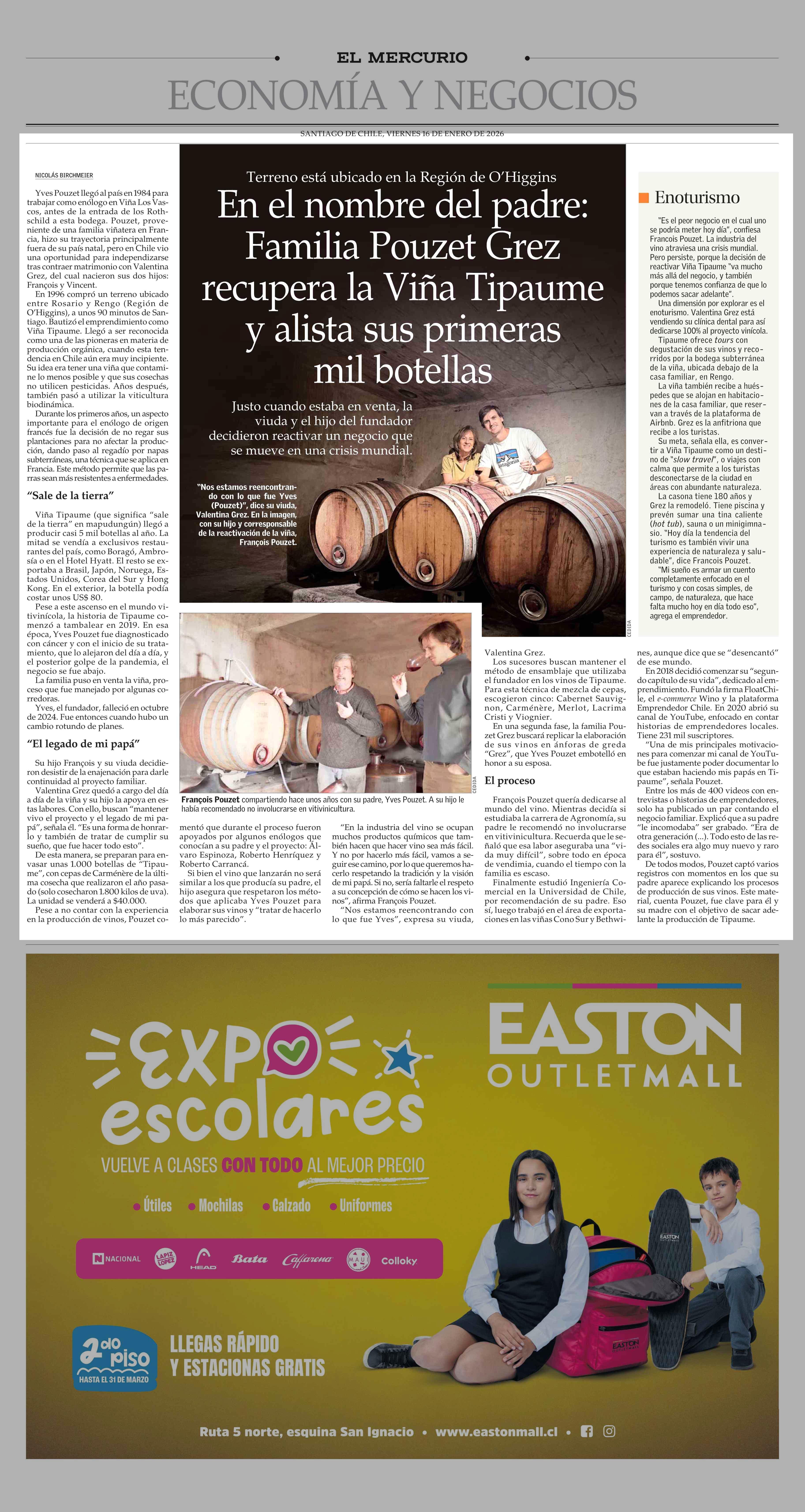 En el nombre del padre: Familia Pouzet Grez recupera la Viña Tipaume y alista sus primeras mil botellas 16-01-2026 El Mercurio |