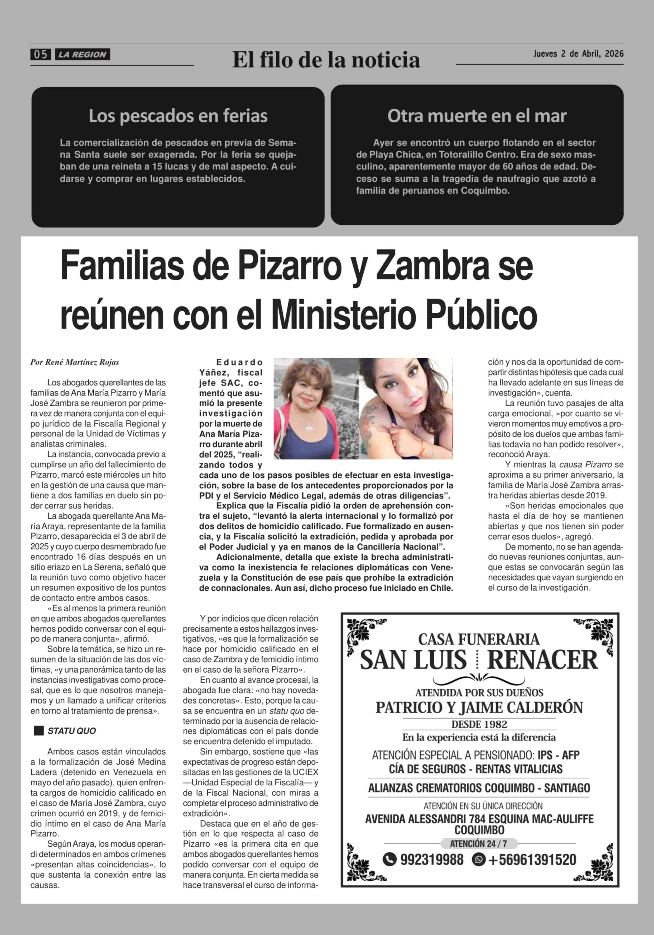 Familias de Pizarro y Zambra se reúnen con el Ministerio Público 02-04-2026 Diario la Región |