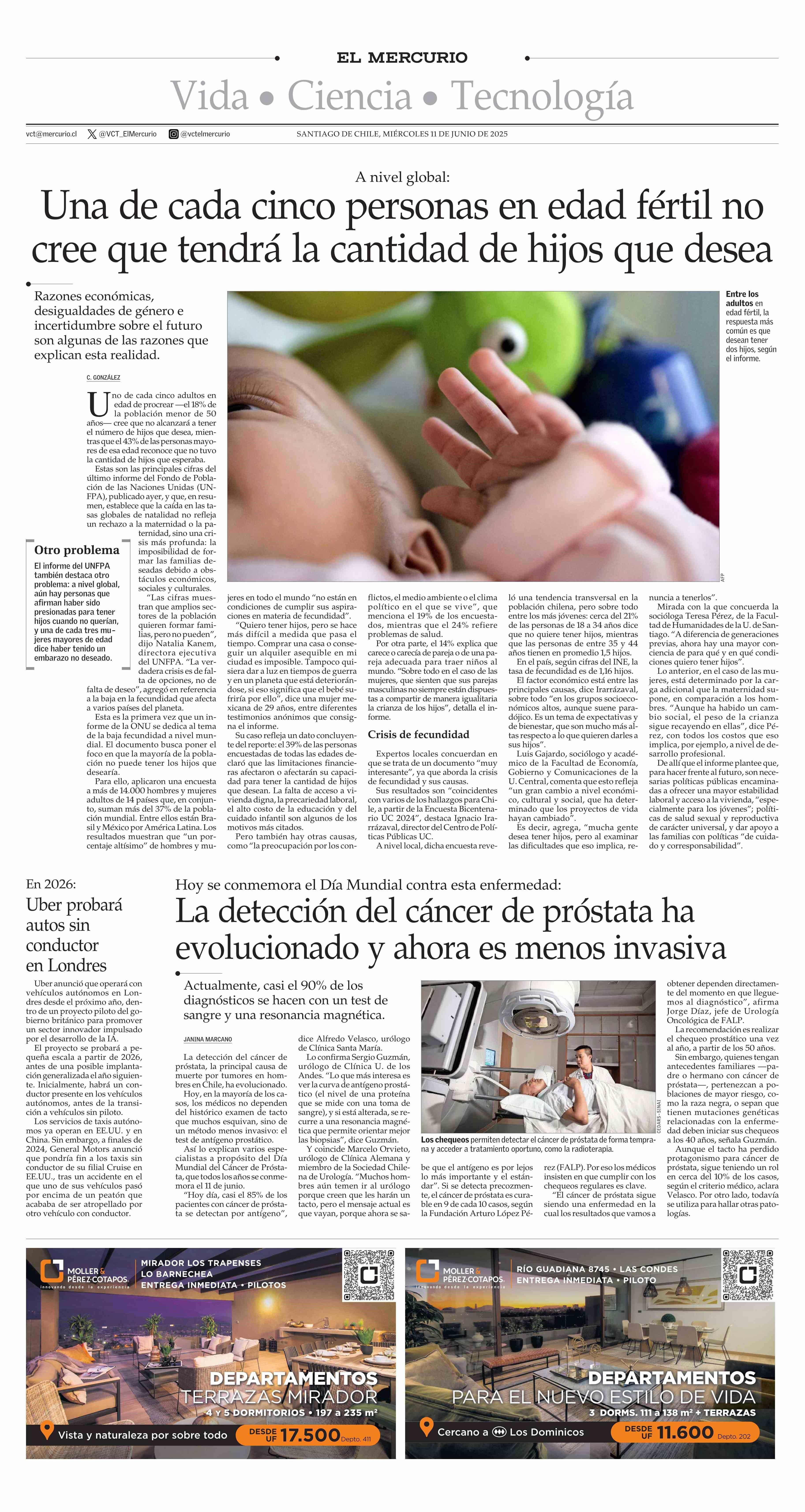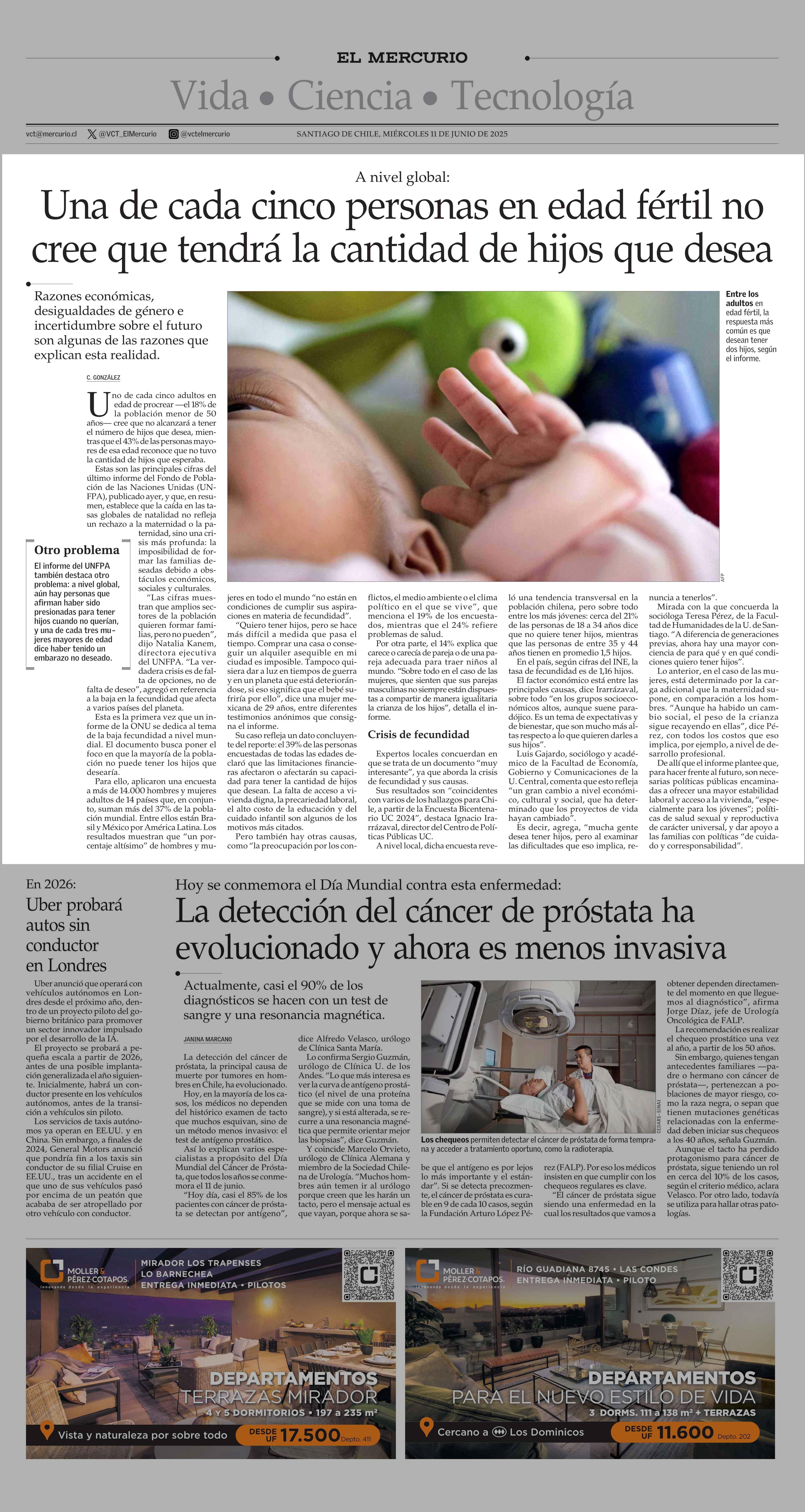 Una de cada cinco personas en edad fértil no cree que tendrá la cantidad de hijos que desea 11-06-2025 El Mercurio |