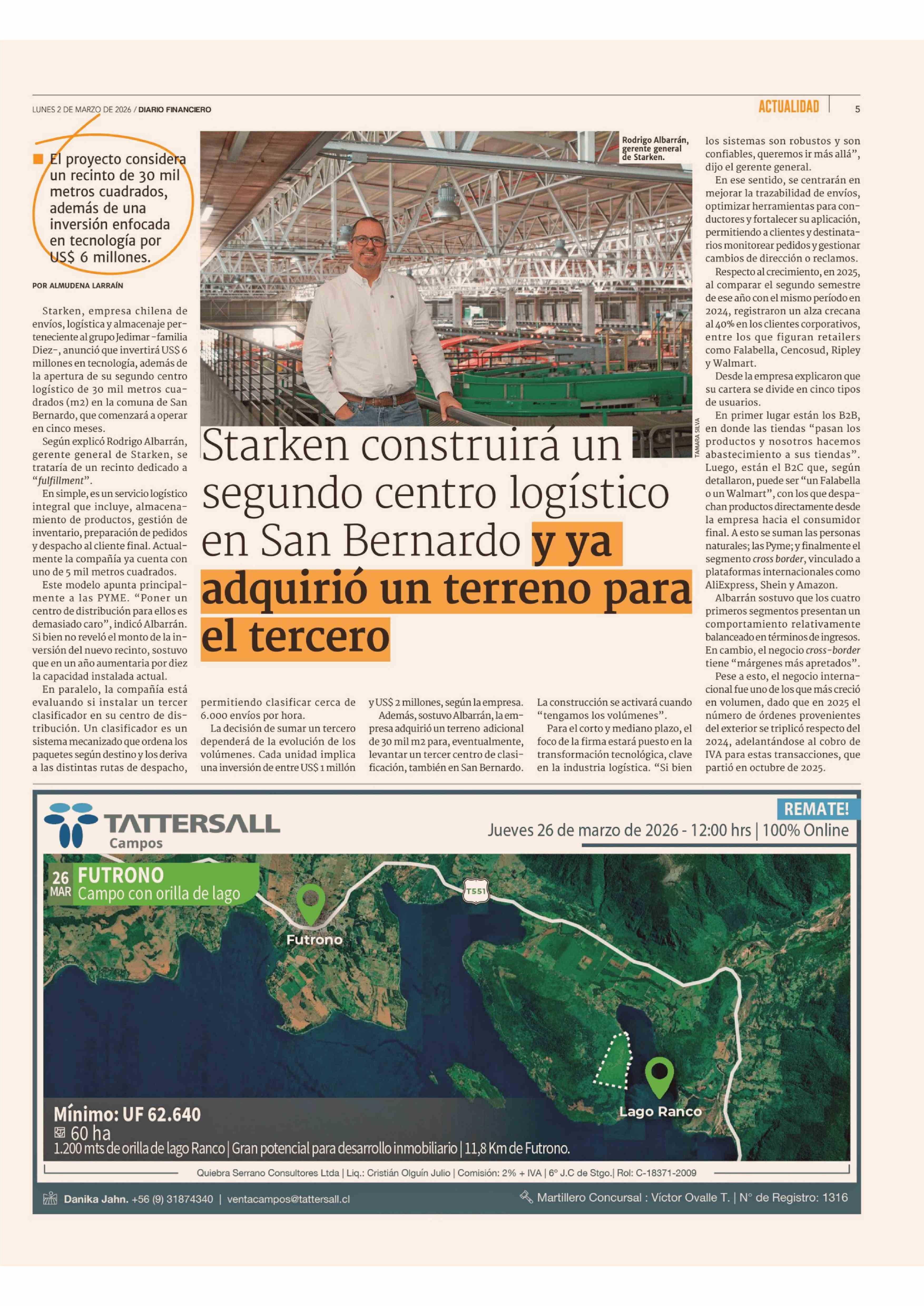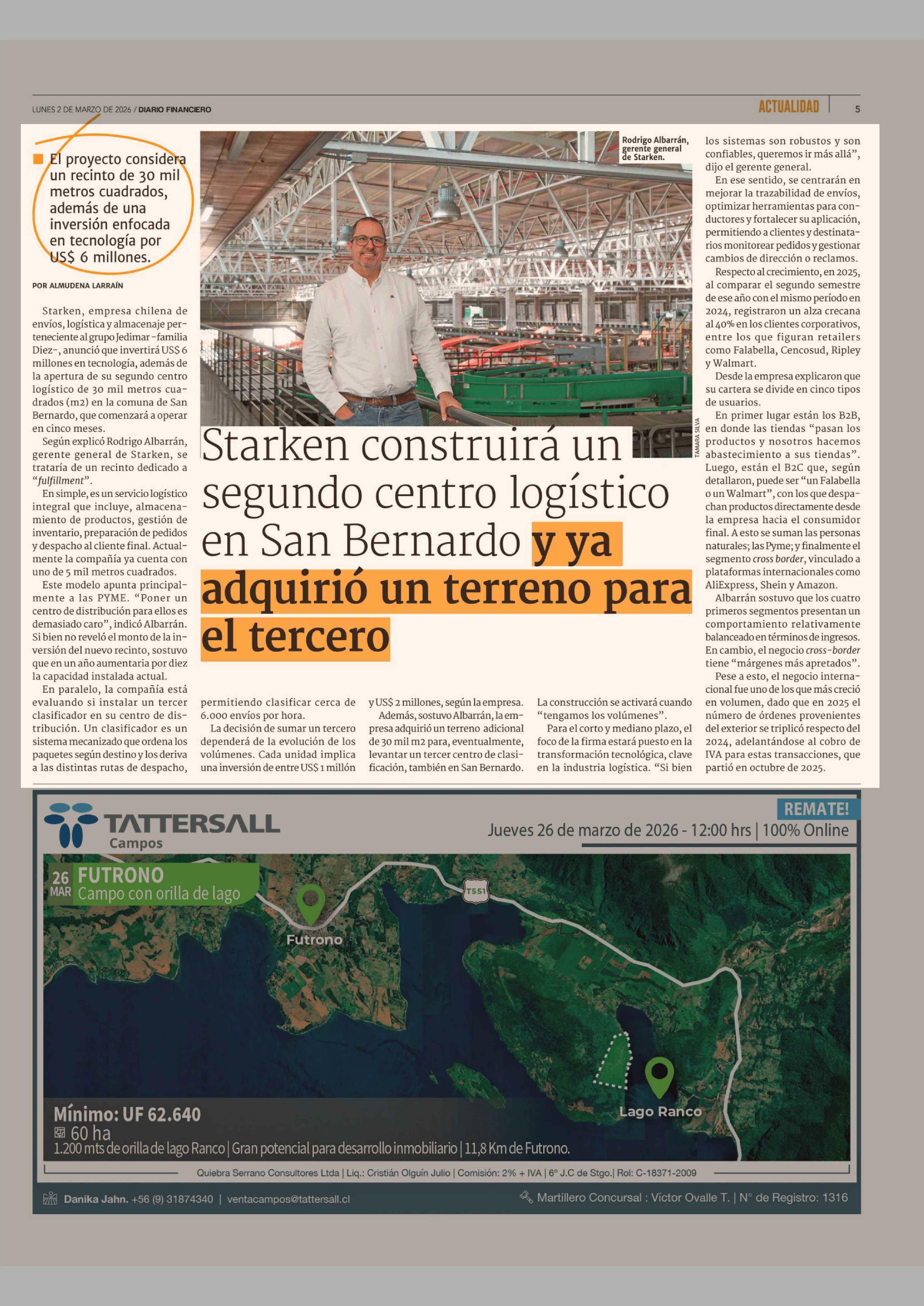 Starken construirá un segundo centro logístico en San Bernardo y ya adquirió un terreno para el tercero 02-03-2026 Diario Financiero |