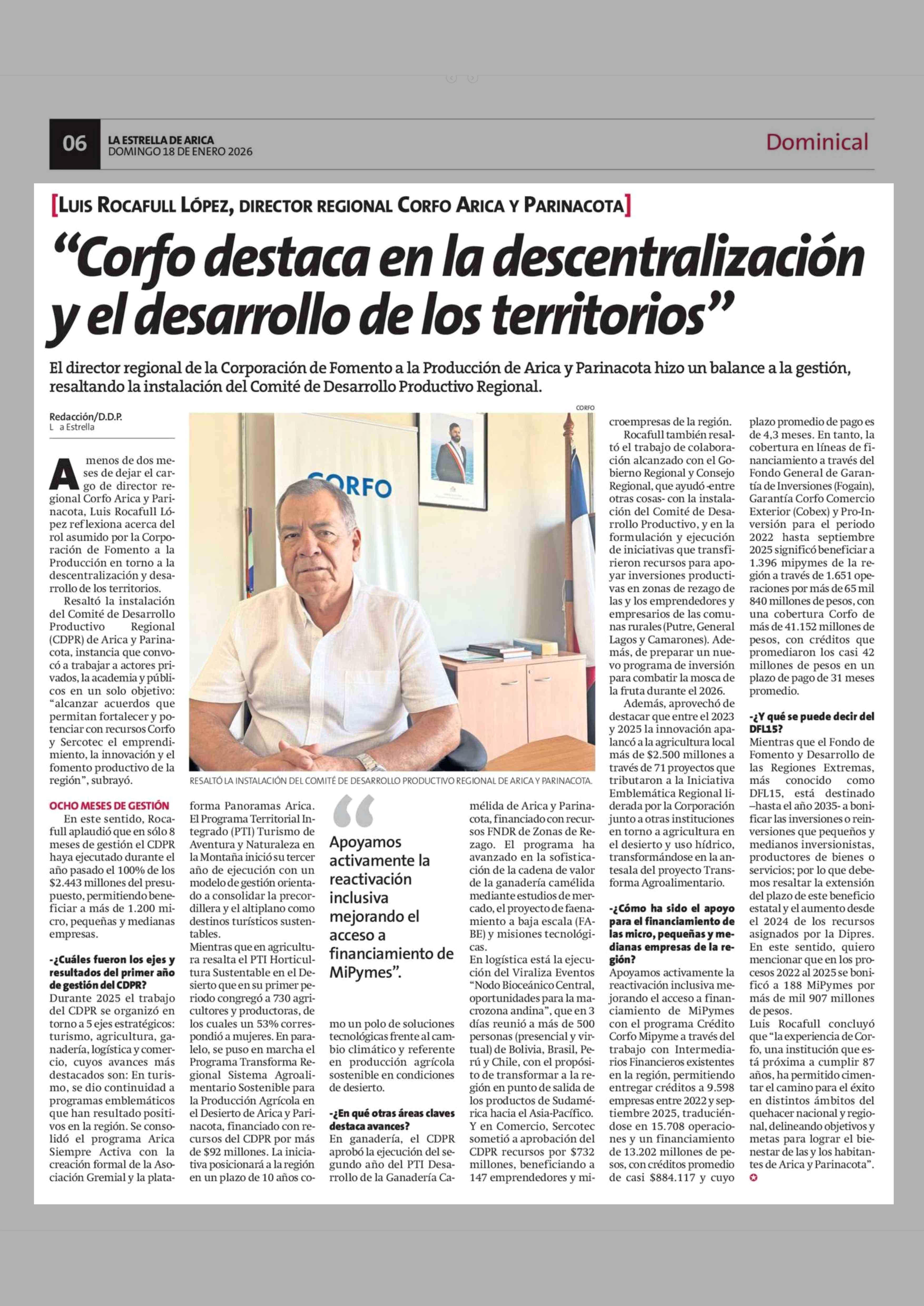 "Corfo destaca en la descentralización y el desarrollo de los territorios" 18-01-2026 La Estrella de Arica |