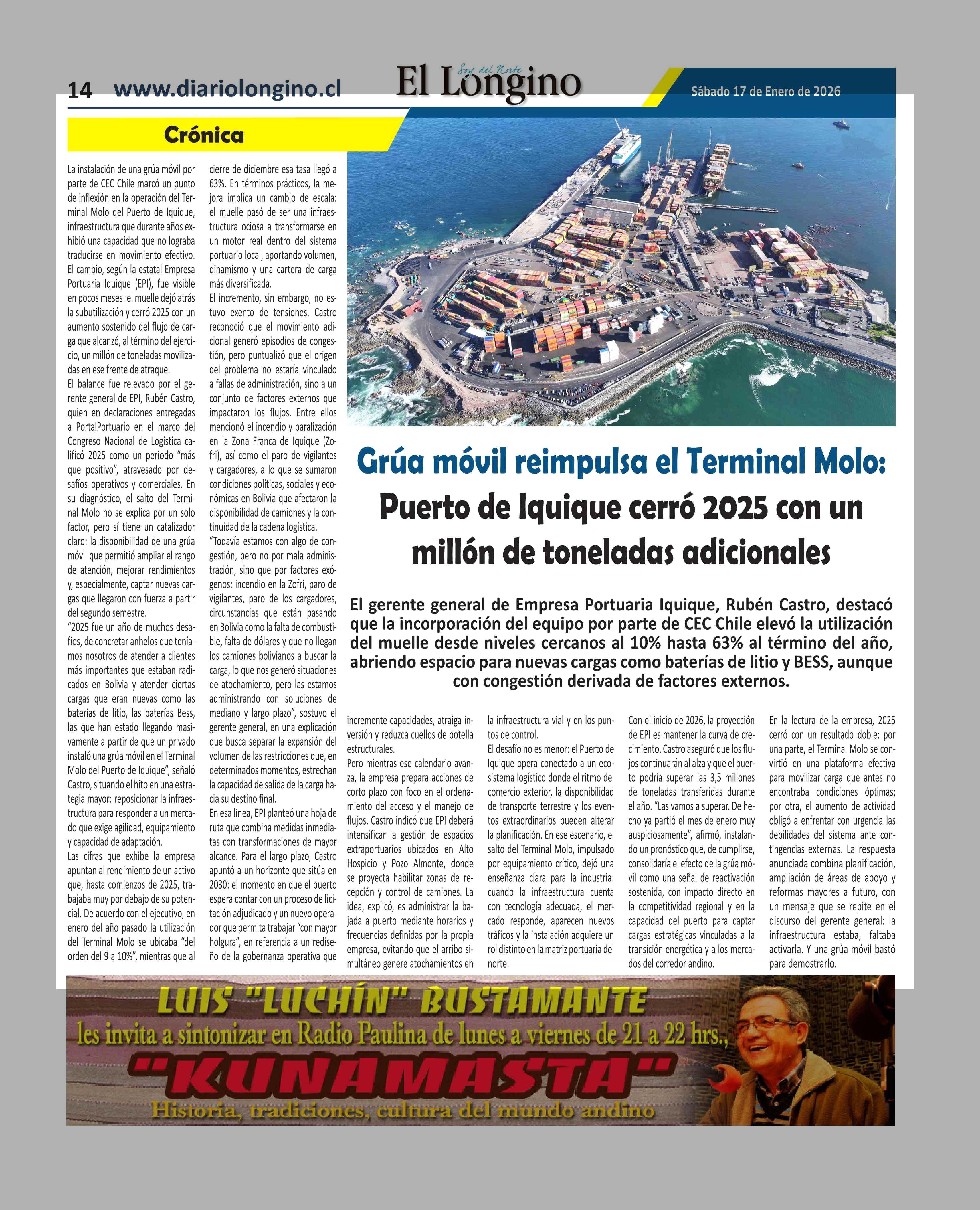 | Título: | Grúa móvil reimpulsa el Terminal Molo: Puerto de Iquique cerró 2025 con un millón de toneladas adicionales |