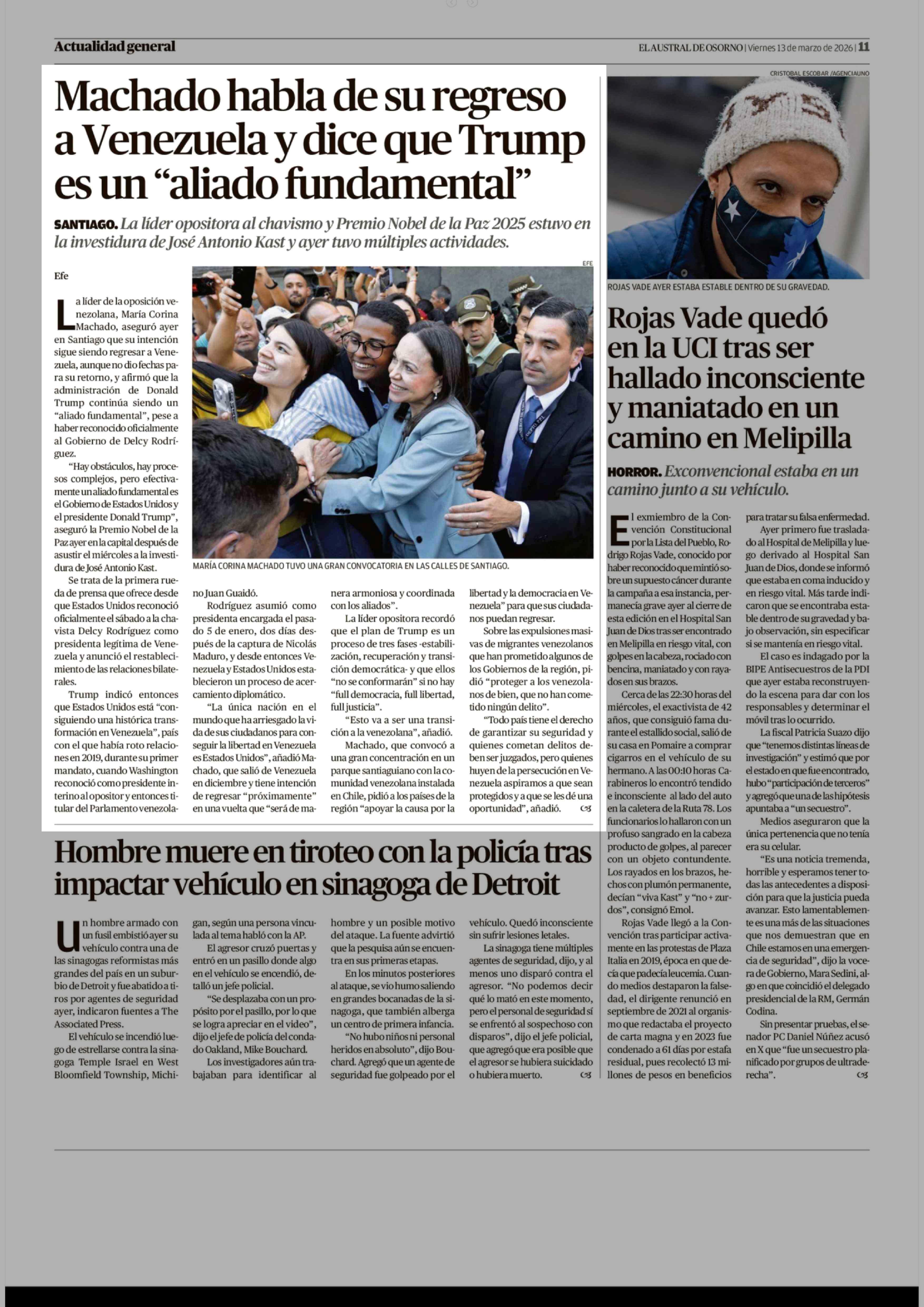 Machado habla de su regreso a Venezuela y dice que Trump es un "aliado fundamental" 13-03-2026 El Austral de Osorno |