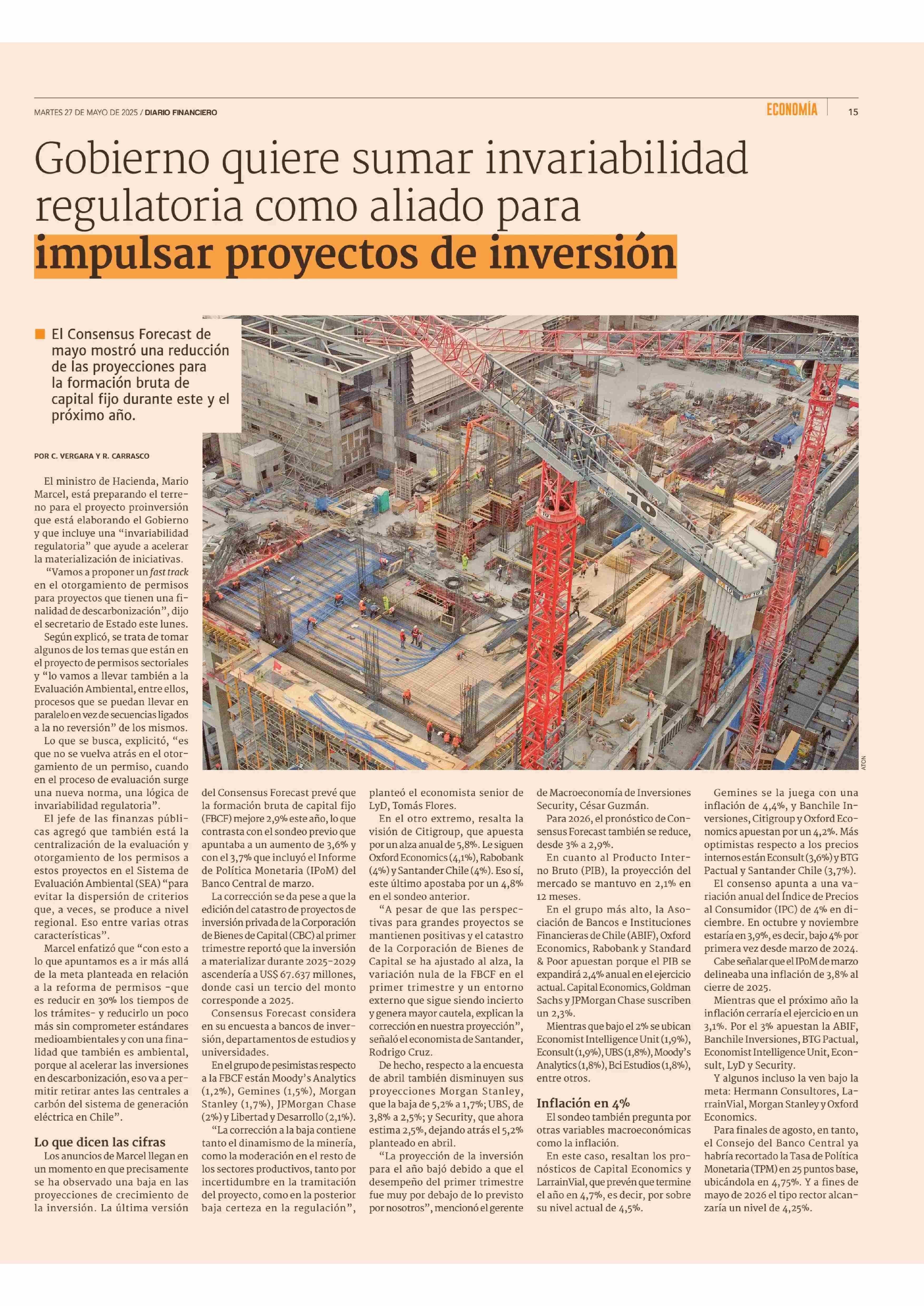 Gobierno quiere sumar invariabilidad regulatoria como aliado para impulsar proyectos de inversión 27-05-2025 Diario Financiero |