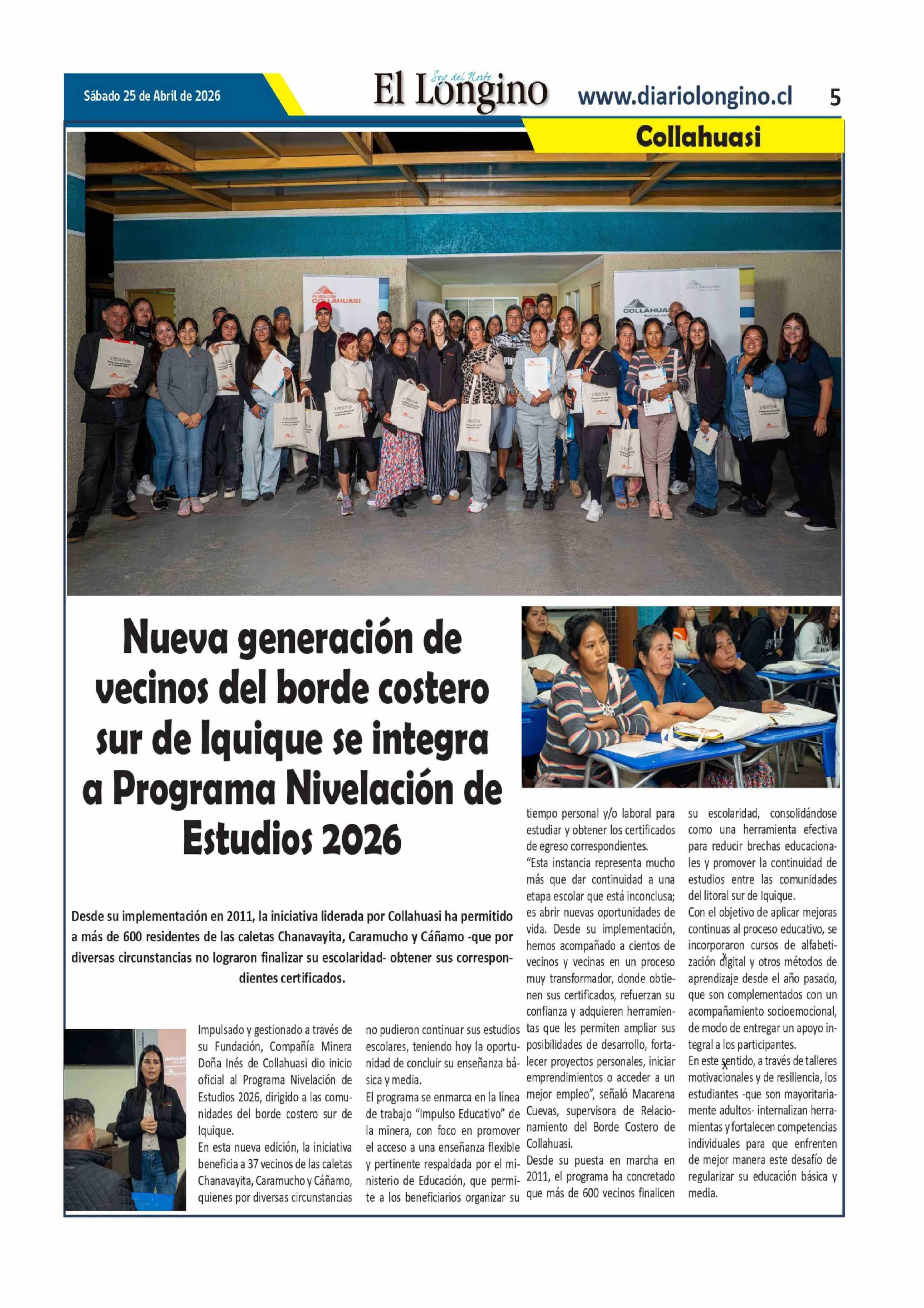 Nueva generación de vecinos del borde costero sur de Iquique se integra a Programa Nivelación de Estudios 2026 25-04-2026 El Longino |