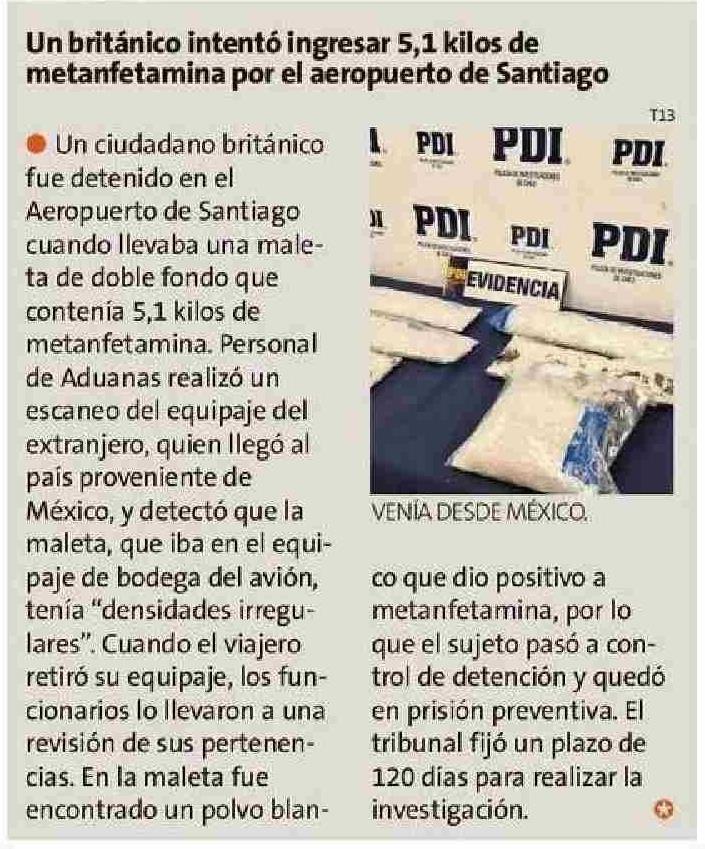 | Título: | Un británico intentó ingresar 5,1 kilos de metanfetamina por el aeropuerto de Santiago |