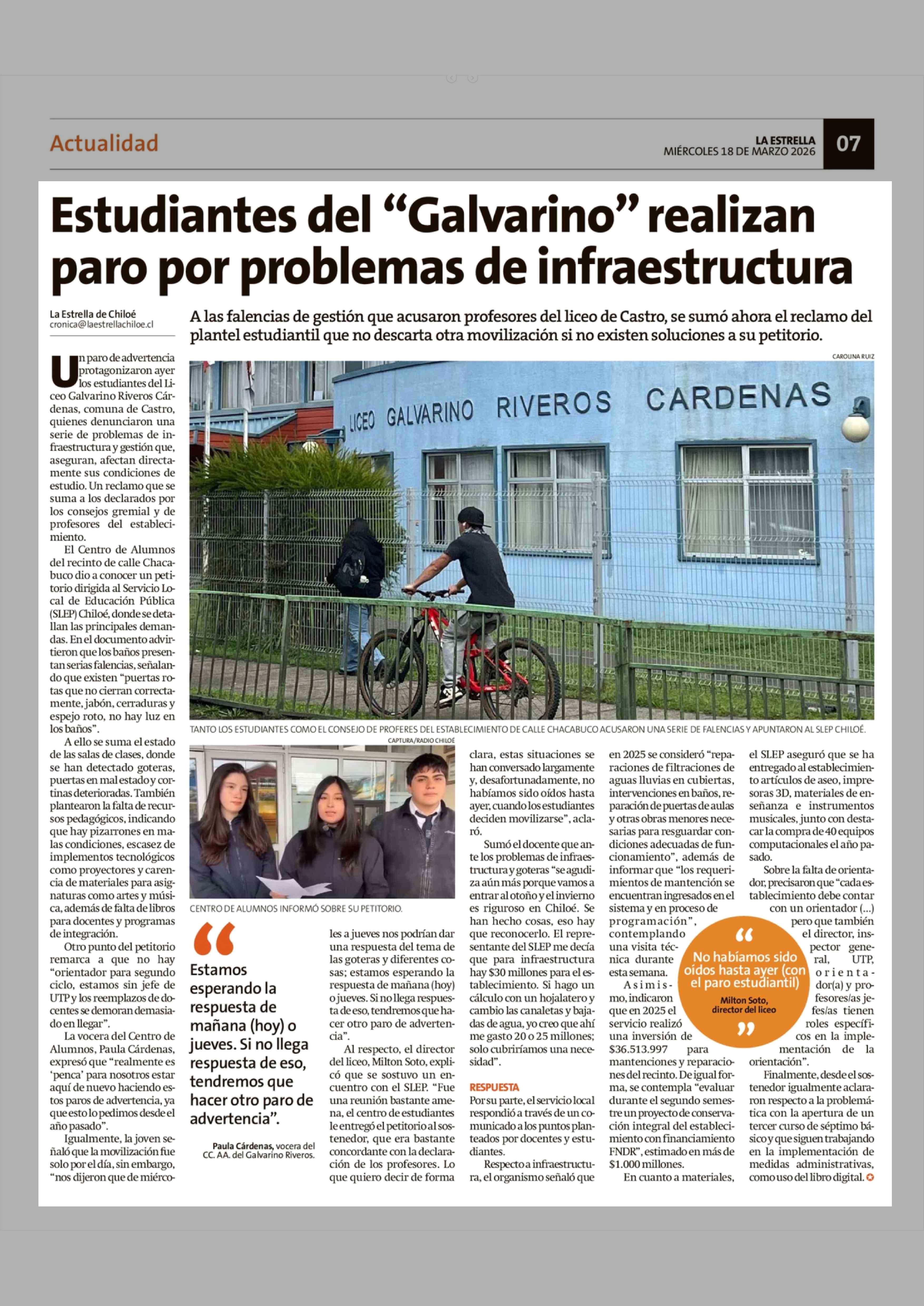 Estudiantes del "Galvarino" realizan paro por problemas de infraestructura 18-03-2026 La Estrella de Chiloé |