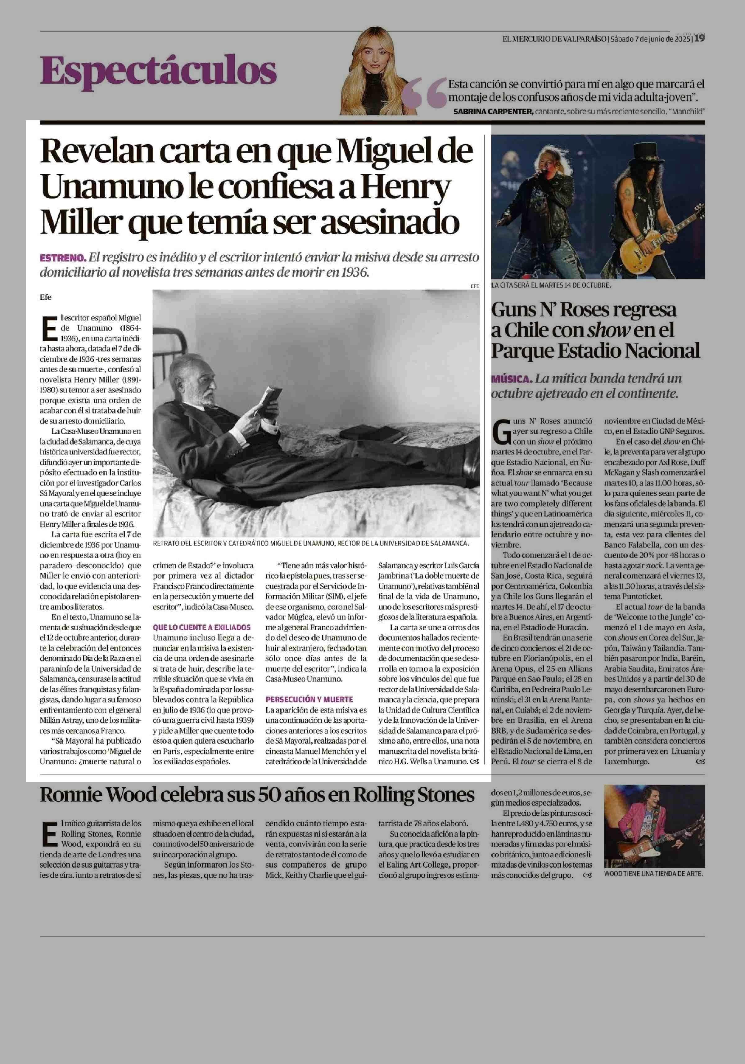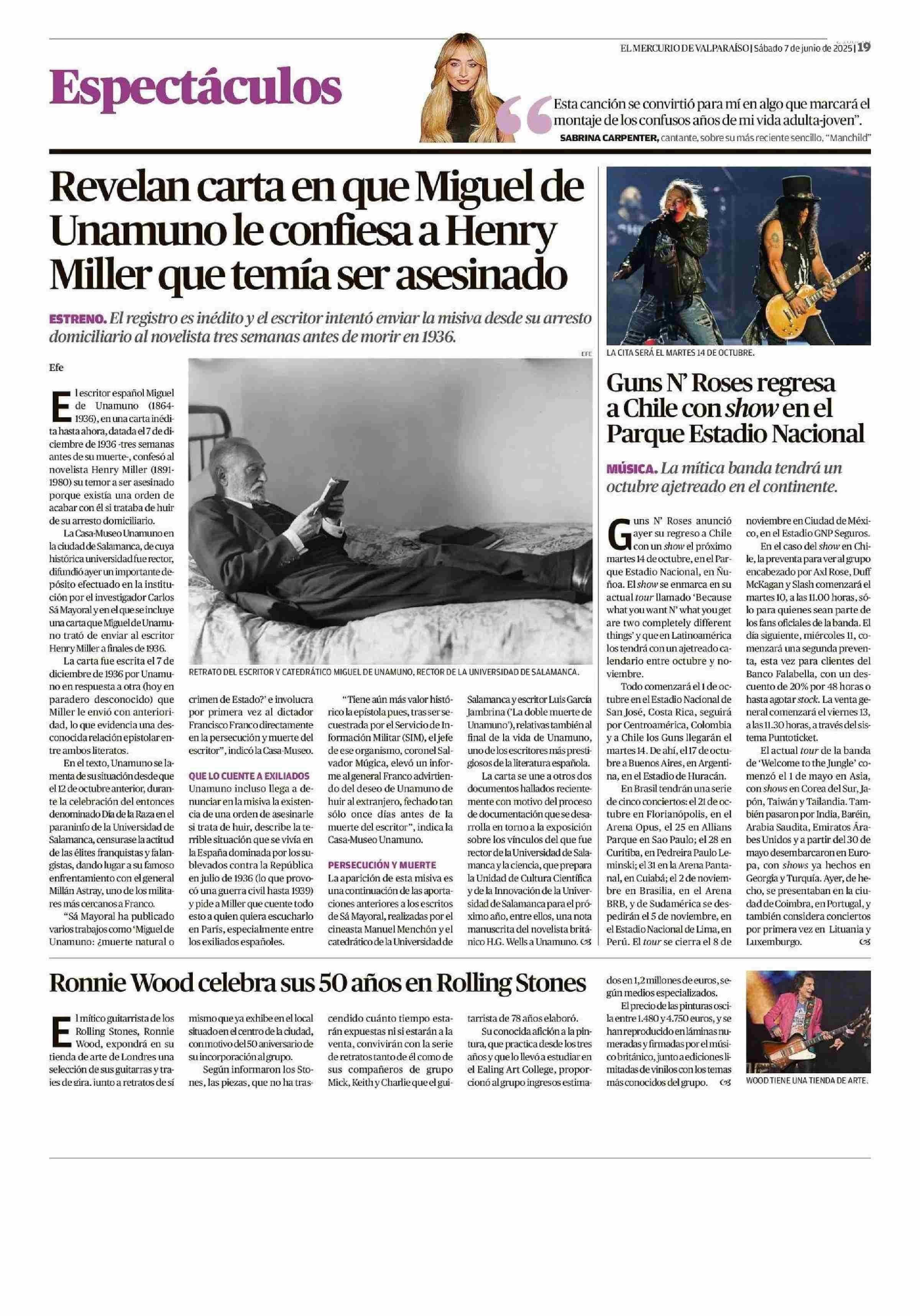 Revelan carta en que Miguel de Unamuno le confiesa a Henry Miller que temía ser asesinado 07-06-2025 El Mercurio de Valparaíso |