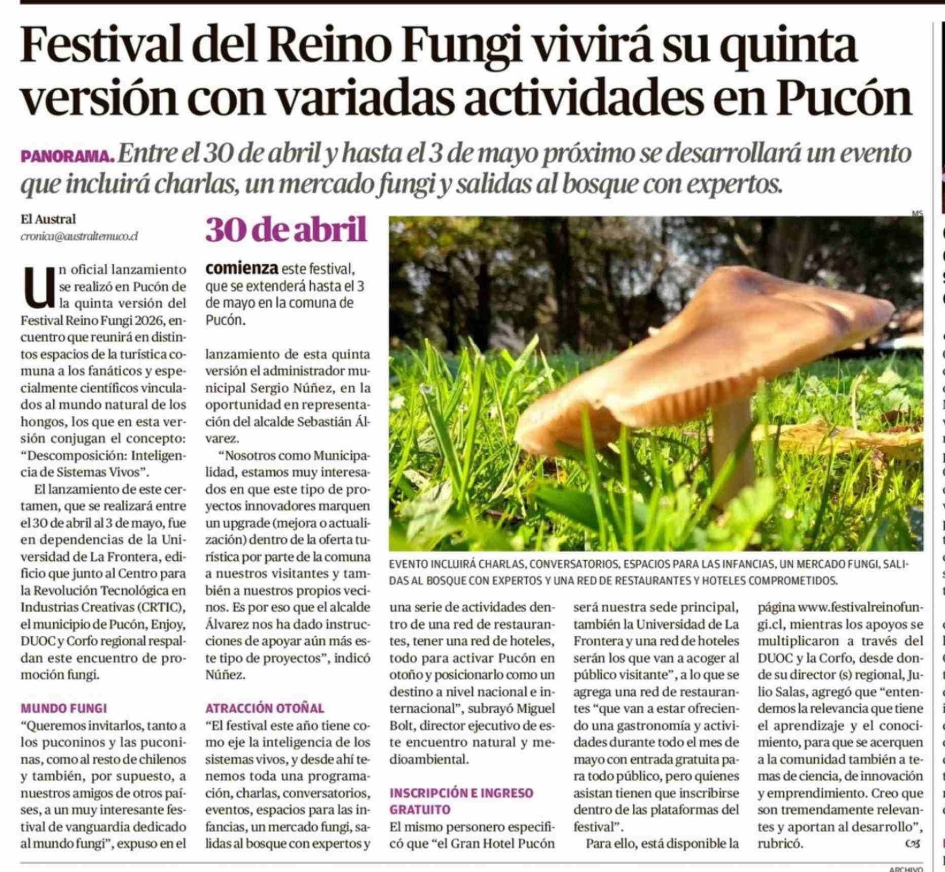Festival del Reino Fungi vivirá su quinta versión con variadas actividades en Pucón 12-04-2026 El Austral de la Araucanía |