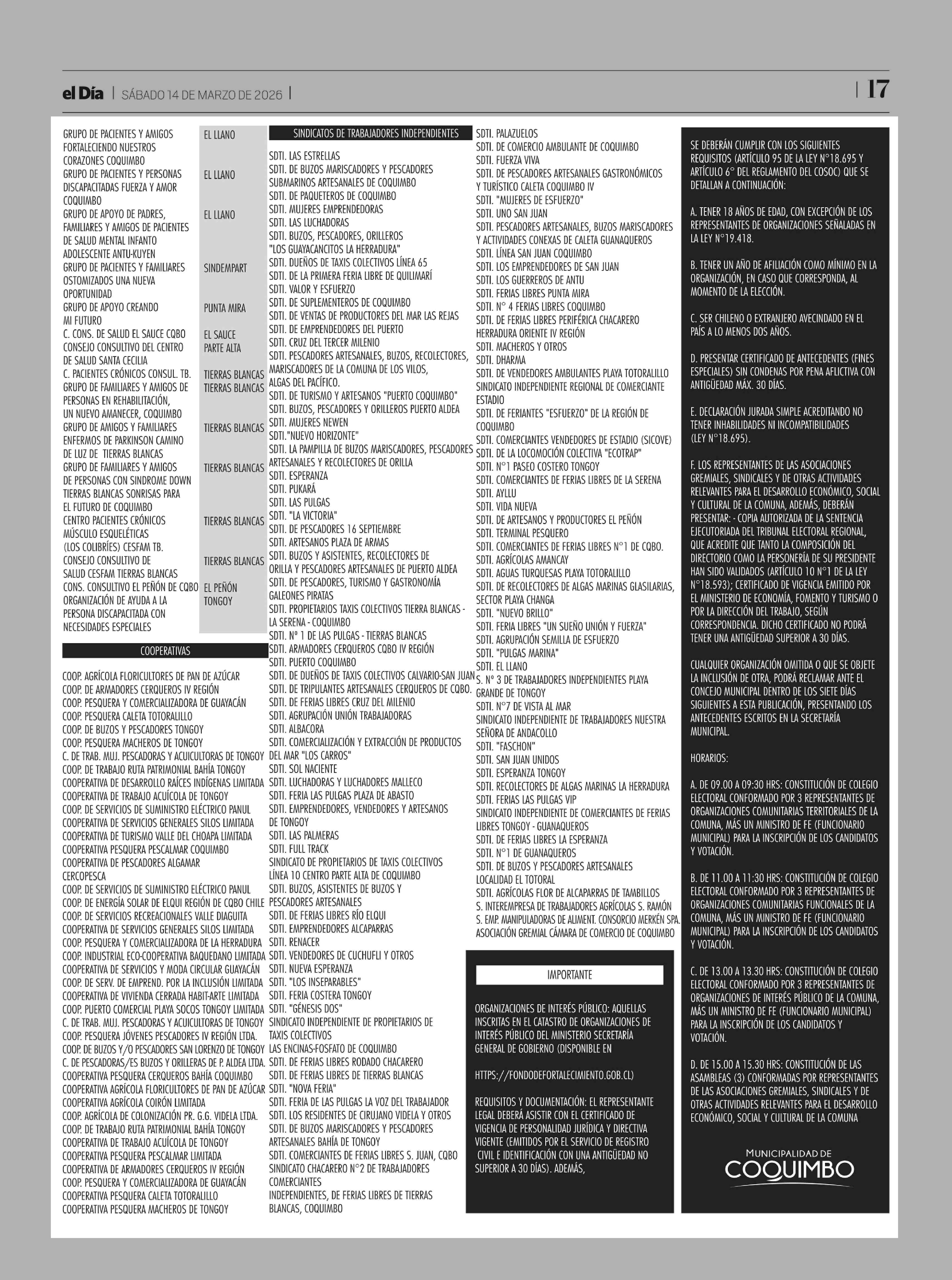 CONVOCATORIA A ELECCIÓN DE CONSEJEROS DEL CONSEJO COMUNAL DE ORGANIZACIONES DE LA SOCIEDAD CIVIL (COSOC) DE COQUIMBO PERIODO 2026 - 2030 ORGANIZACIONES COMUNITARIAS TERRITORIALES, FUNCIONALES, DE INTERÉS PÚBLICO E INSTITUCIONES PARTICIPANTES