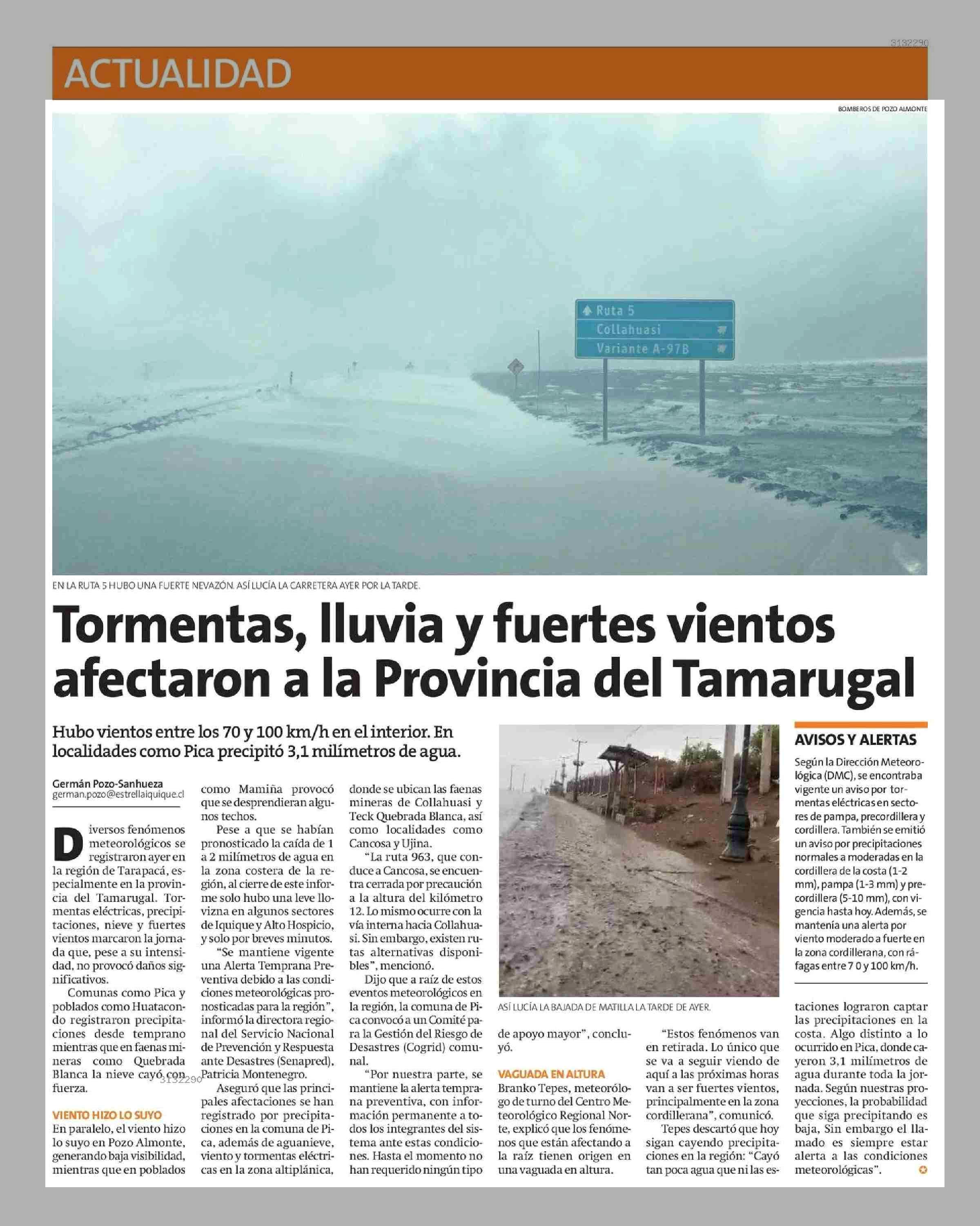 | Título: | Tormentas, lluvia y fuertes vientos afectaron a la Provincia del Tamarugal |