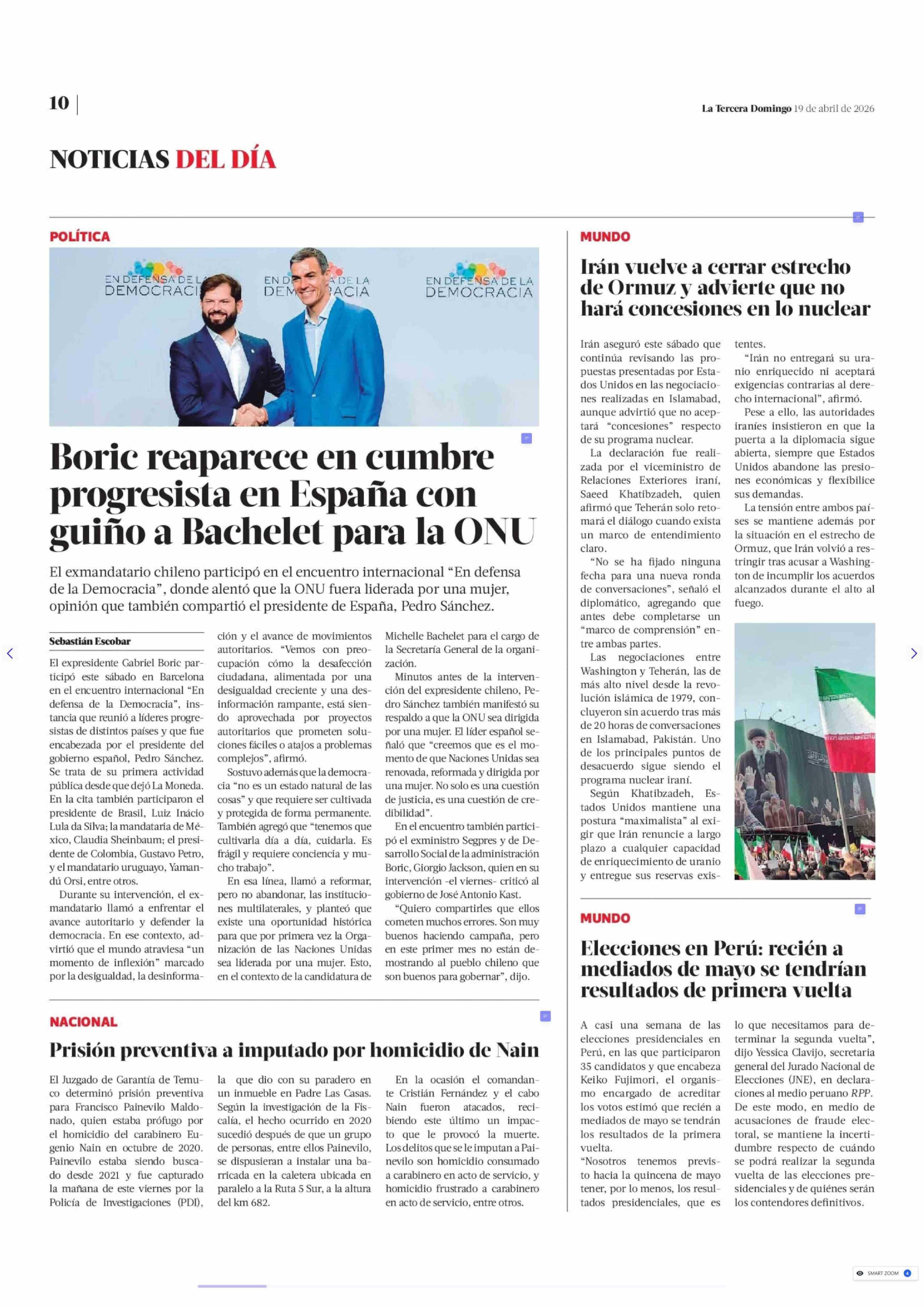 Boric reaparece en cumbre progresista en España con guiño a Bachelet para la ONU 19-04-2026 La Tercera |