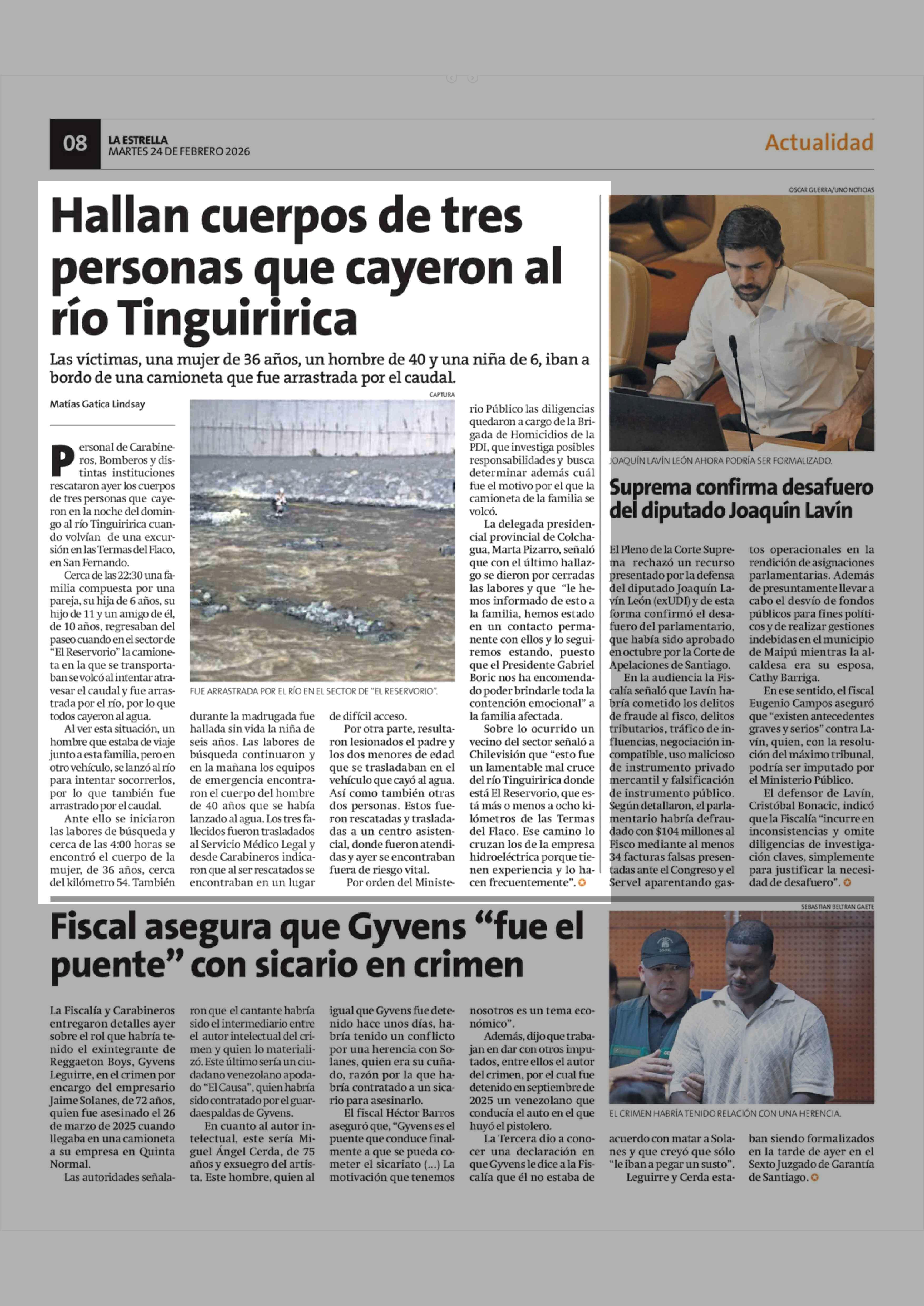 Hallan cuerpos de tres personas que cayeron al río Tinguiririca 24-02-2026 La Estrella de Concepción |
