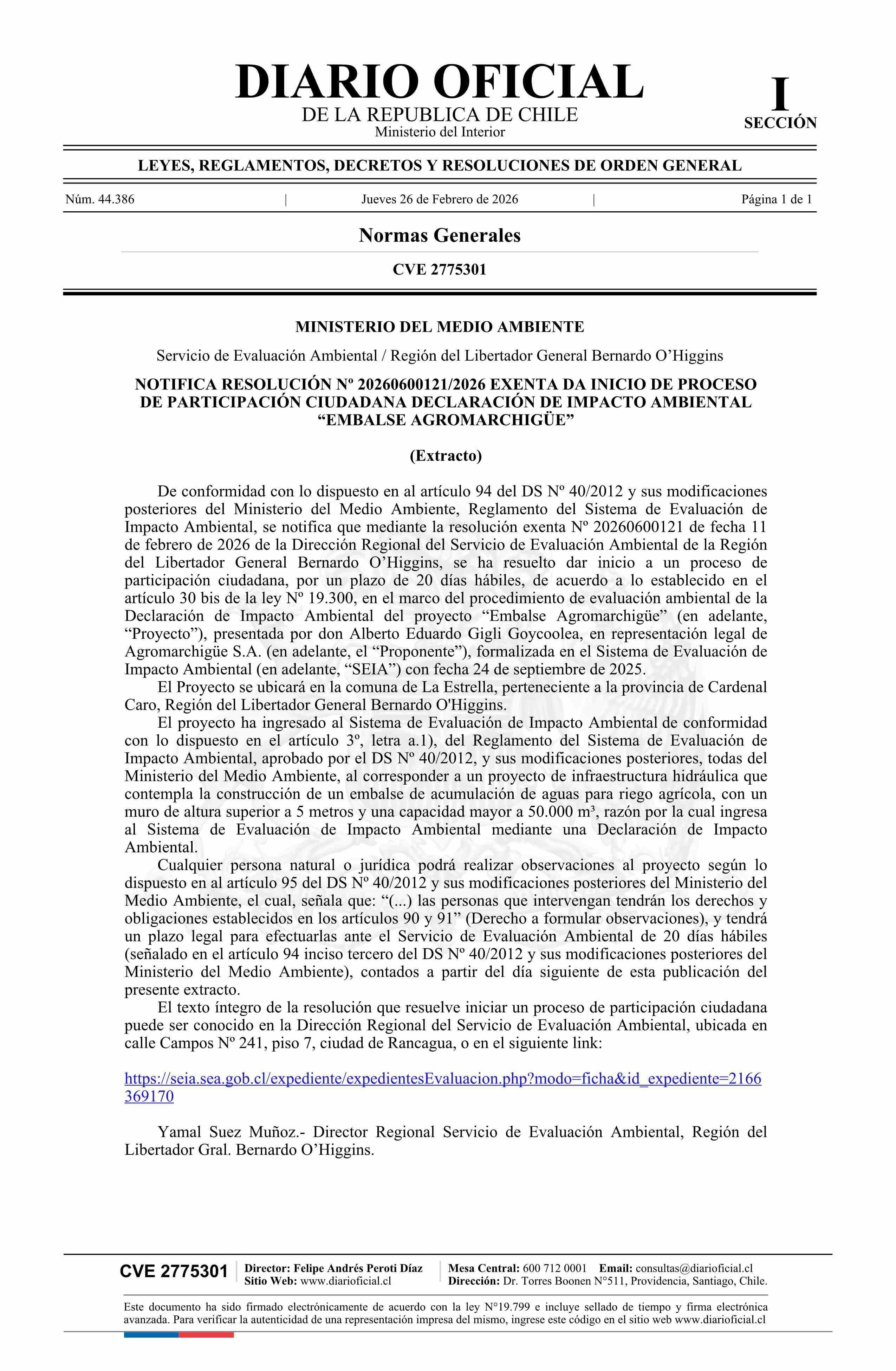 Extracto de resolución exenta número 20260600121, de 2026.- Da Inicio de proceso de participación ciudadana Declaración de Impacto Ambiental Embalse Agromarchigüe 26-02-2026 Diario Oficial Edición Electrónica |
