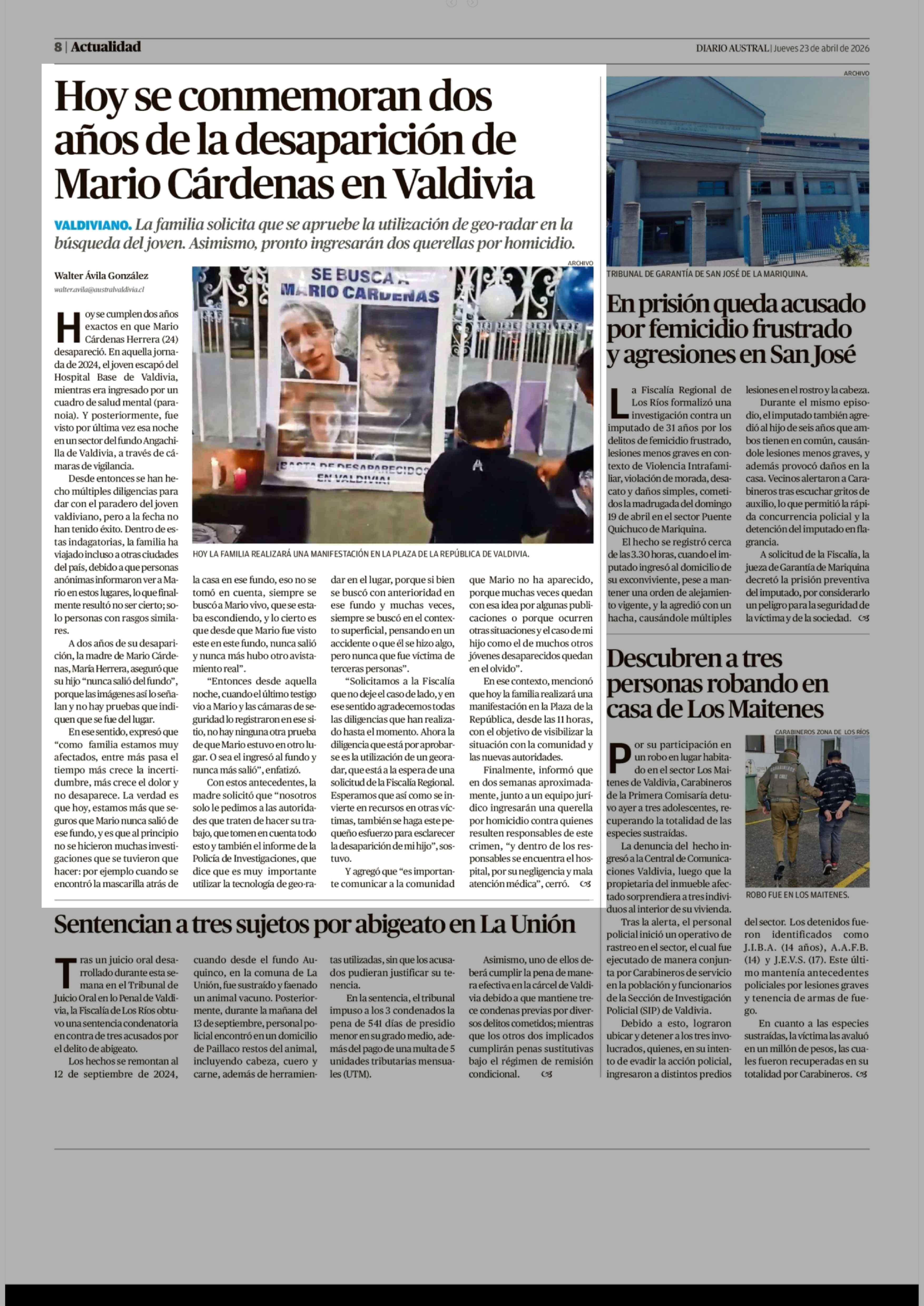 Hoy se conmemoran dos años de la desaparición de Mario Cárdenas en Valdivia 23-04-2026 Diario Austral Región de Los Ríos |