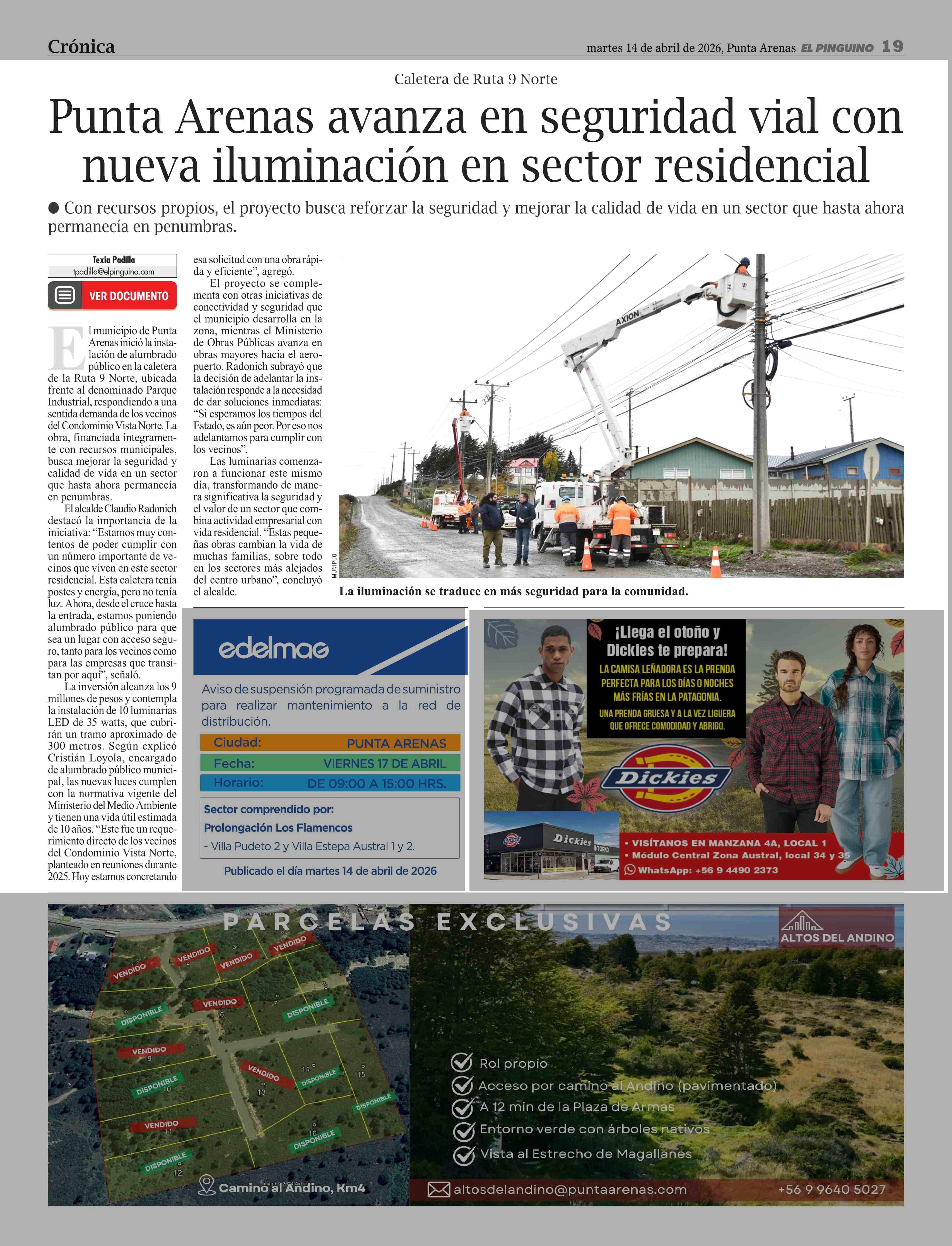 Caletera de Kuta 9 Norte Punta Arenas avanza en seguridad vial con nueva iluminación en sector residencial 14-04-2026 El Pingüino |