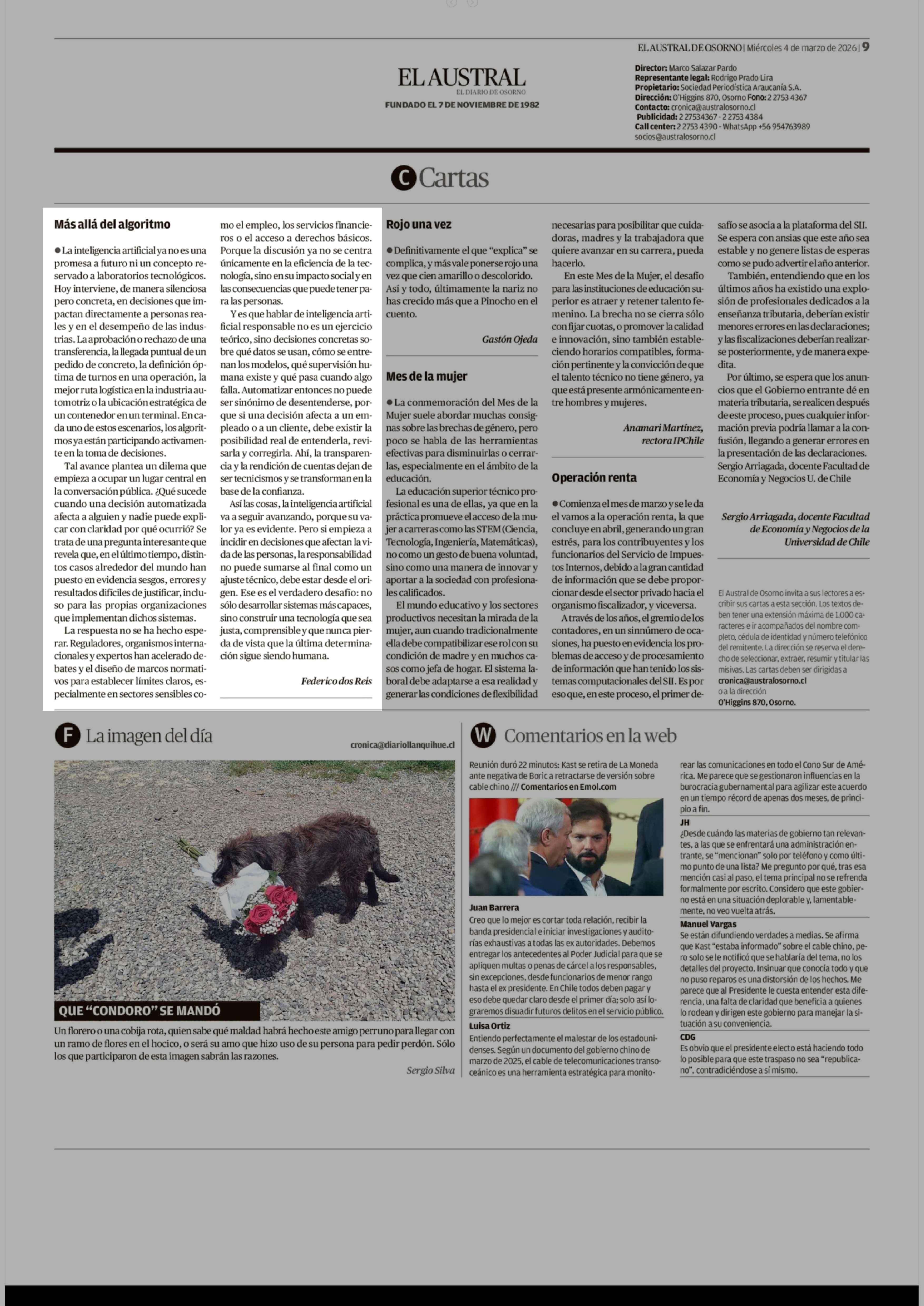 Cartas: Más allá del algoritmo 04-03-2026 El Austral de Osorno |