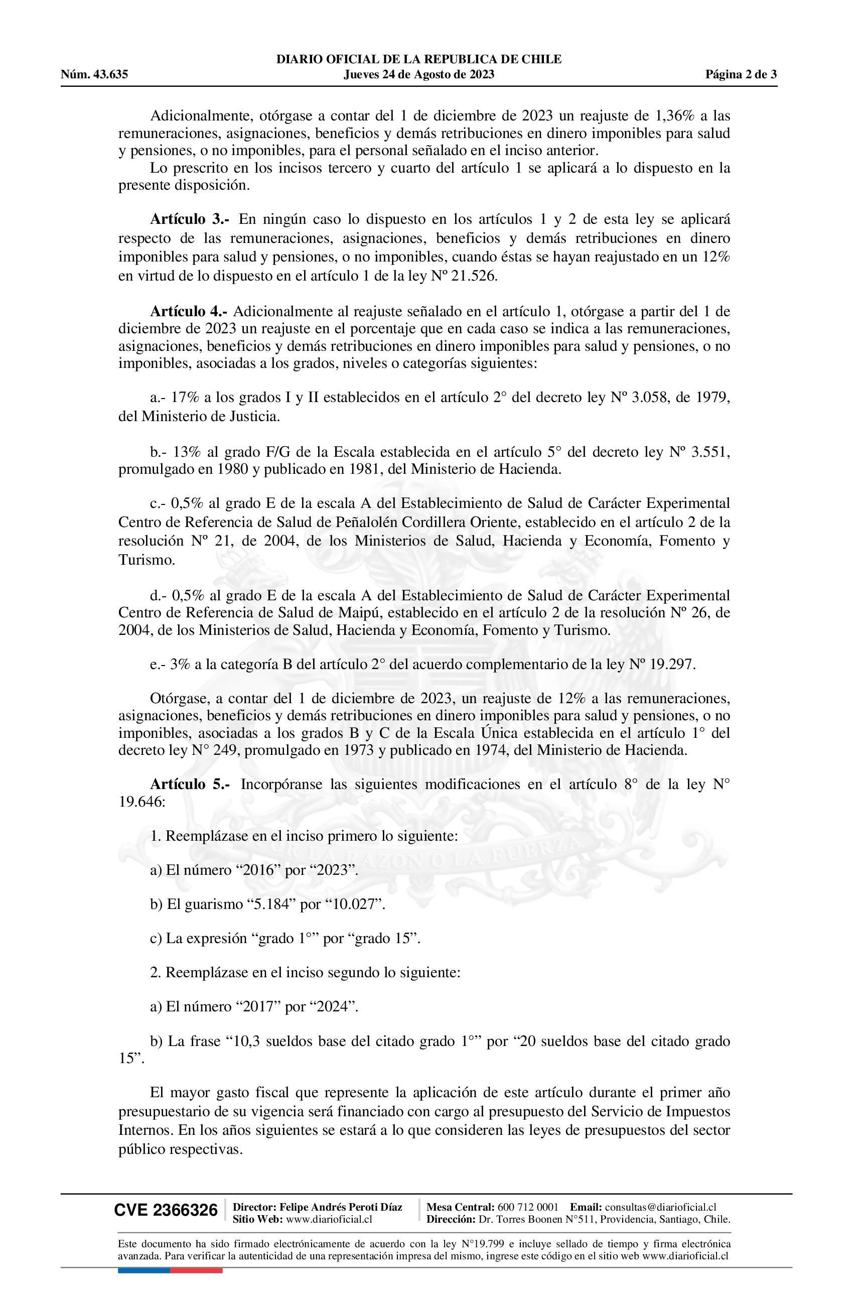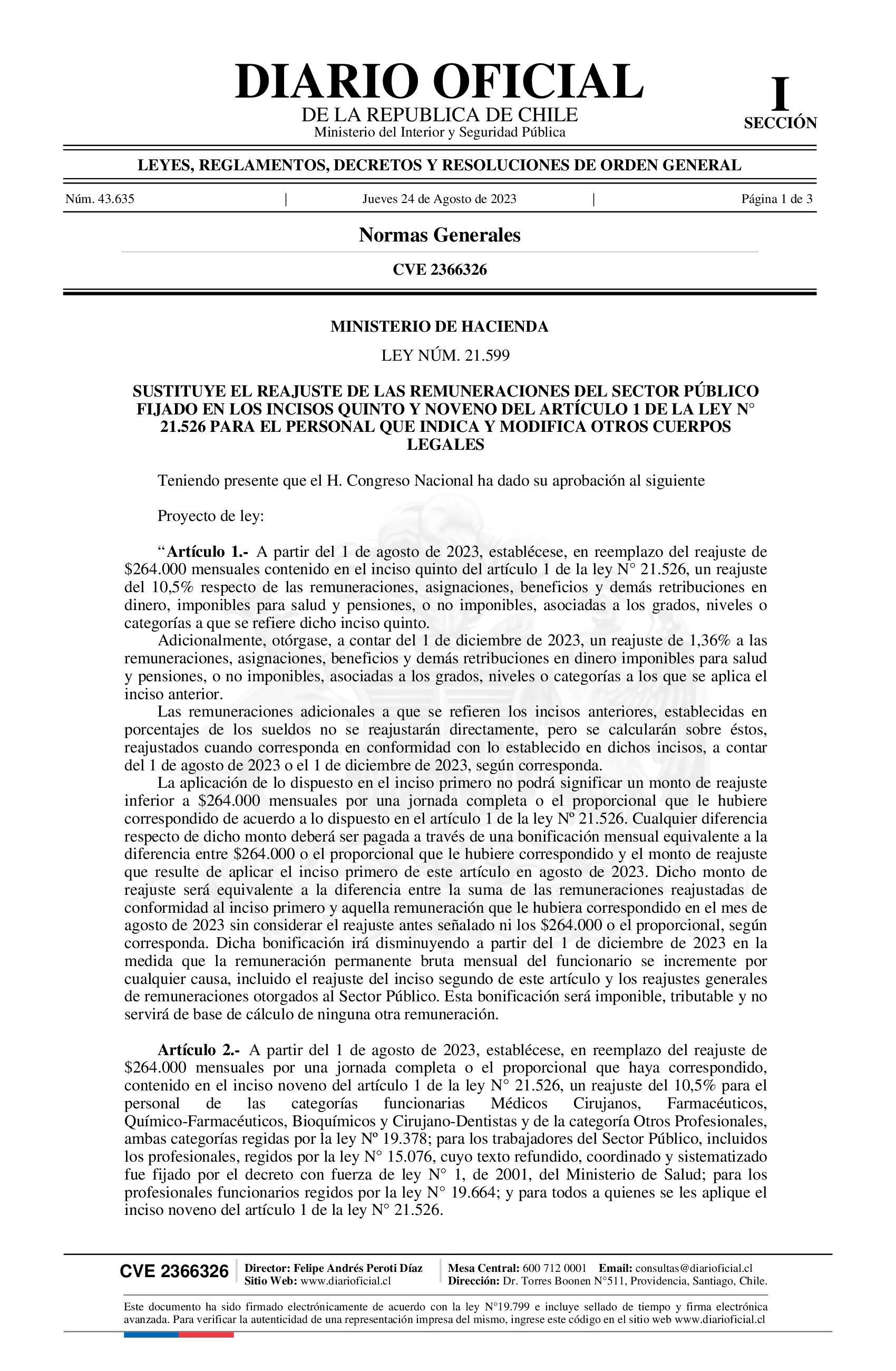 | Título: | Ministerio de Hacienda Sustituye El Reajuste de Las Remuneraciones Del Sector Público Fijado En Los Incisos Quinto Y Noveno Del Artículo 1 de la Ley N° 21.526 Para El Personal Que Indica Y Modifica Otros Cuerpos |