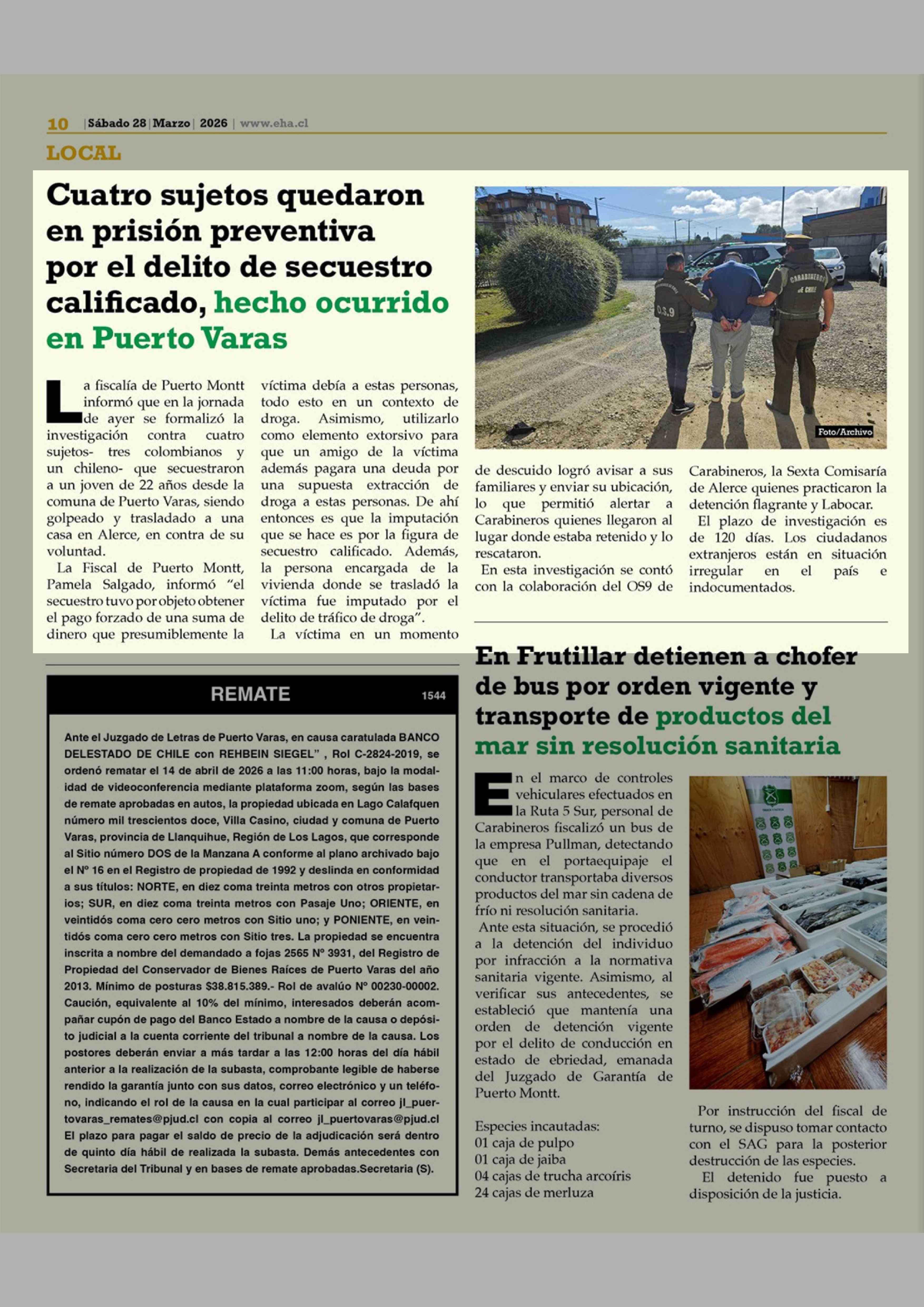 Cuatro sujetos quedaron en prisión preventiva por el delito de secuestro calificado, hecho ocurrido en Puerto Varas 28-03-2026 El Heraldo Austral |