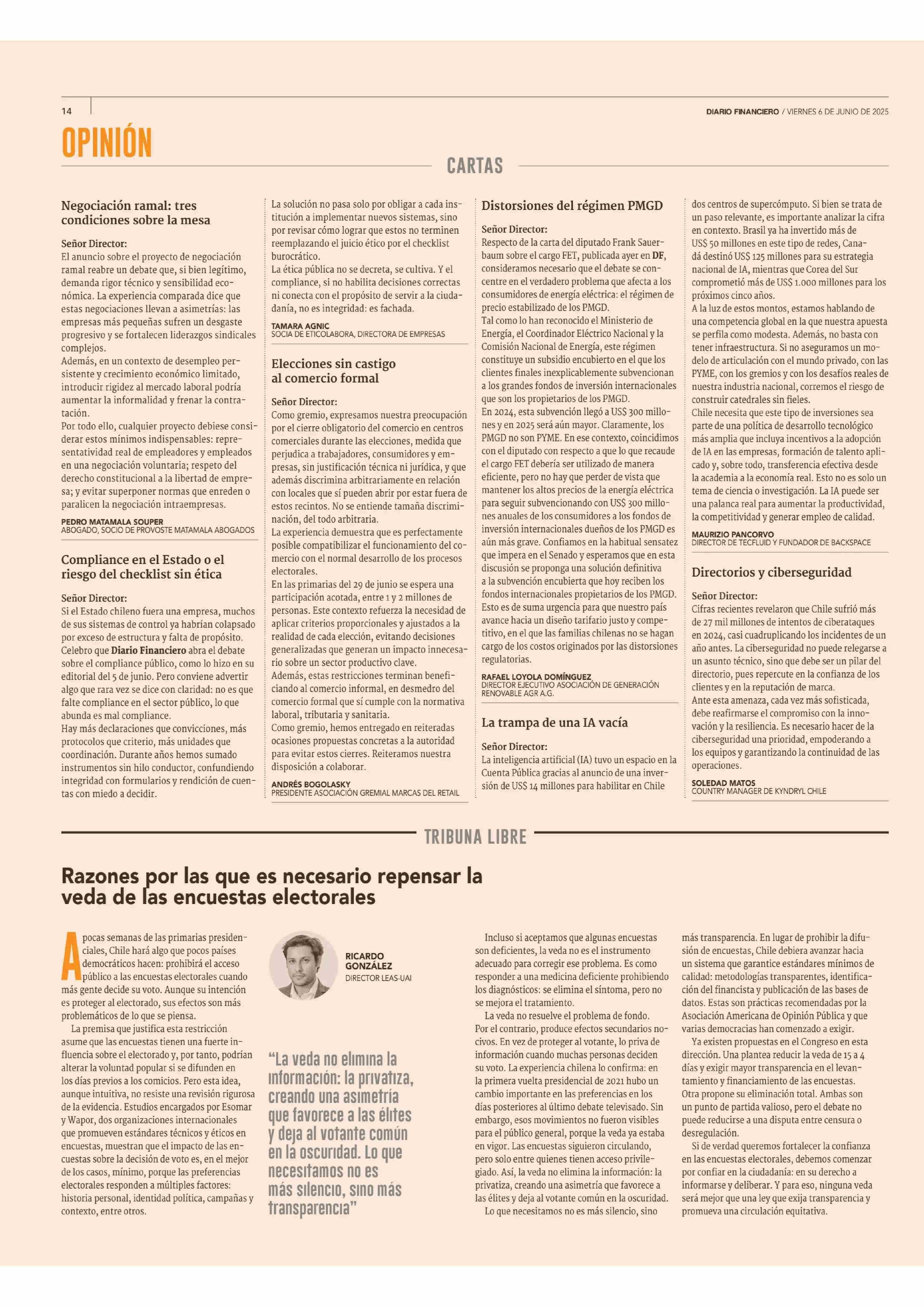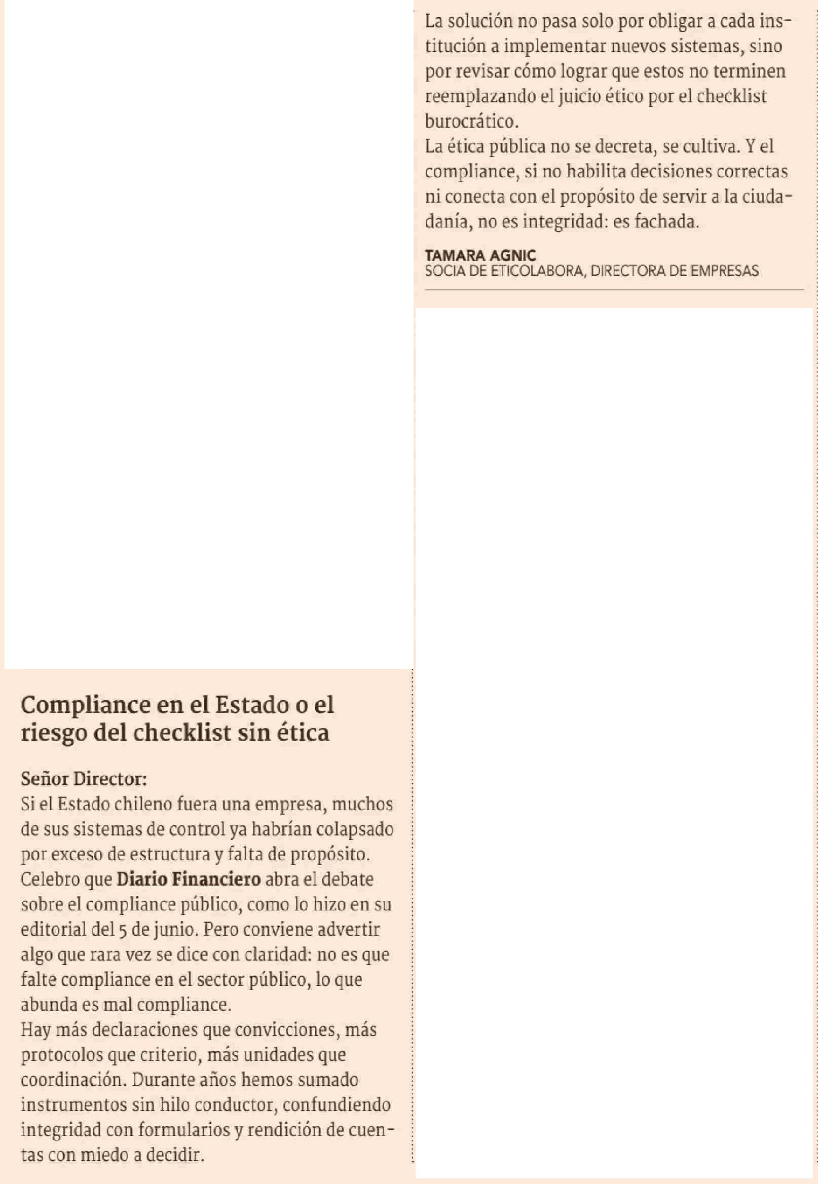 CARTAS: Compliance en el Estado o el riesgo del checklist sin ética 06-06-2025 Diario Financiero |