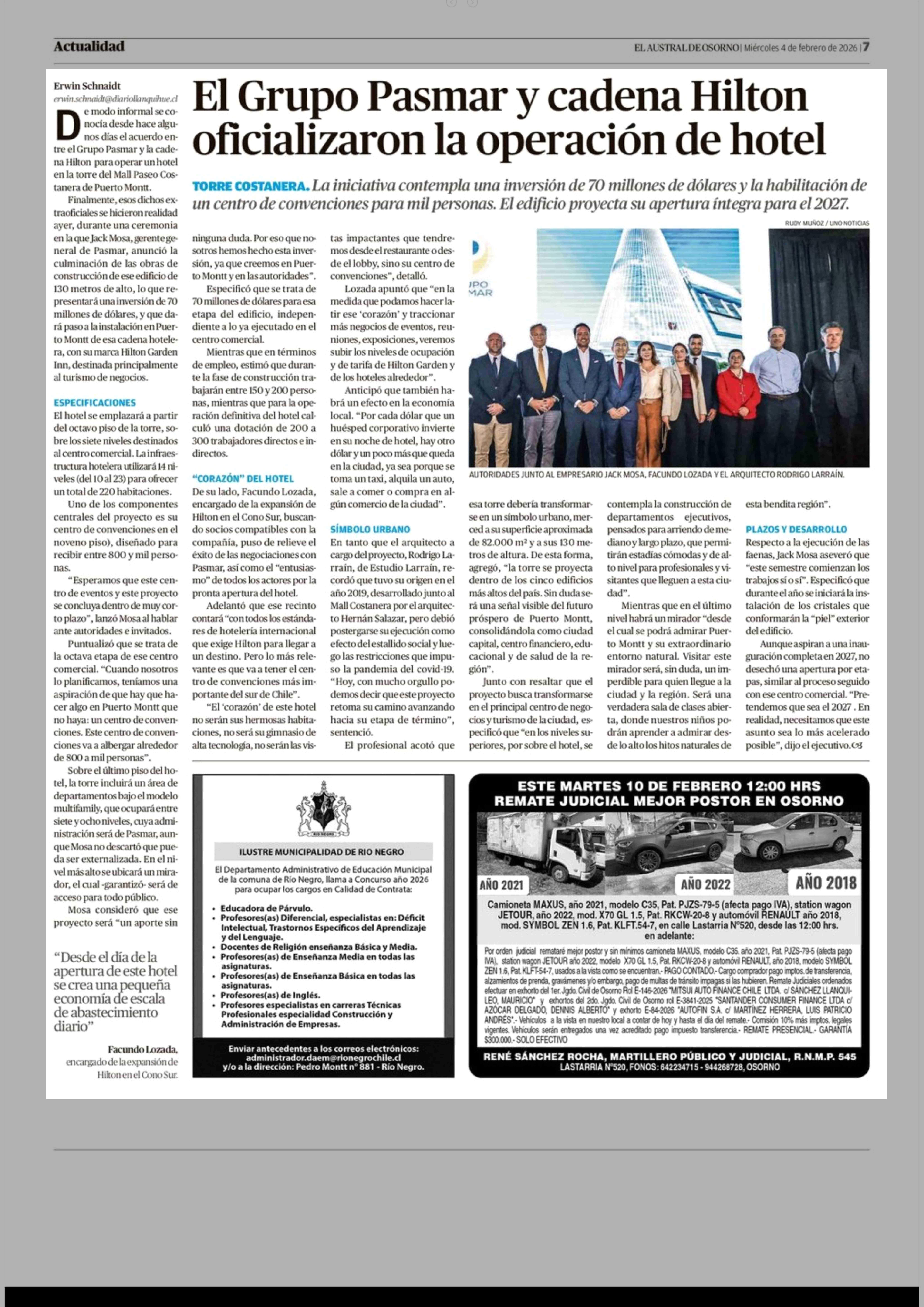 El Grupo Pasmar y cadena Hilton oficializaron la operación de hotel 04-02-2026 El Austral de Osorno |