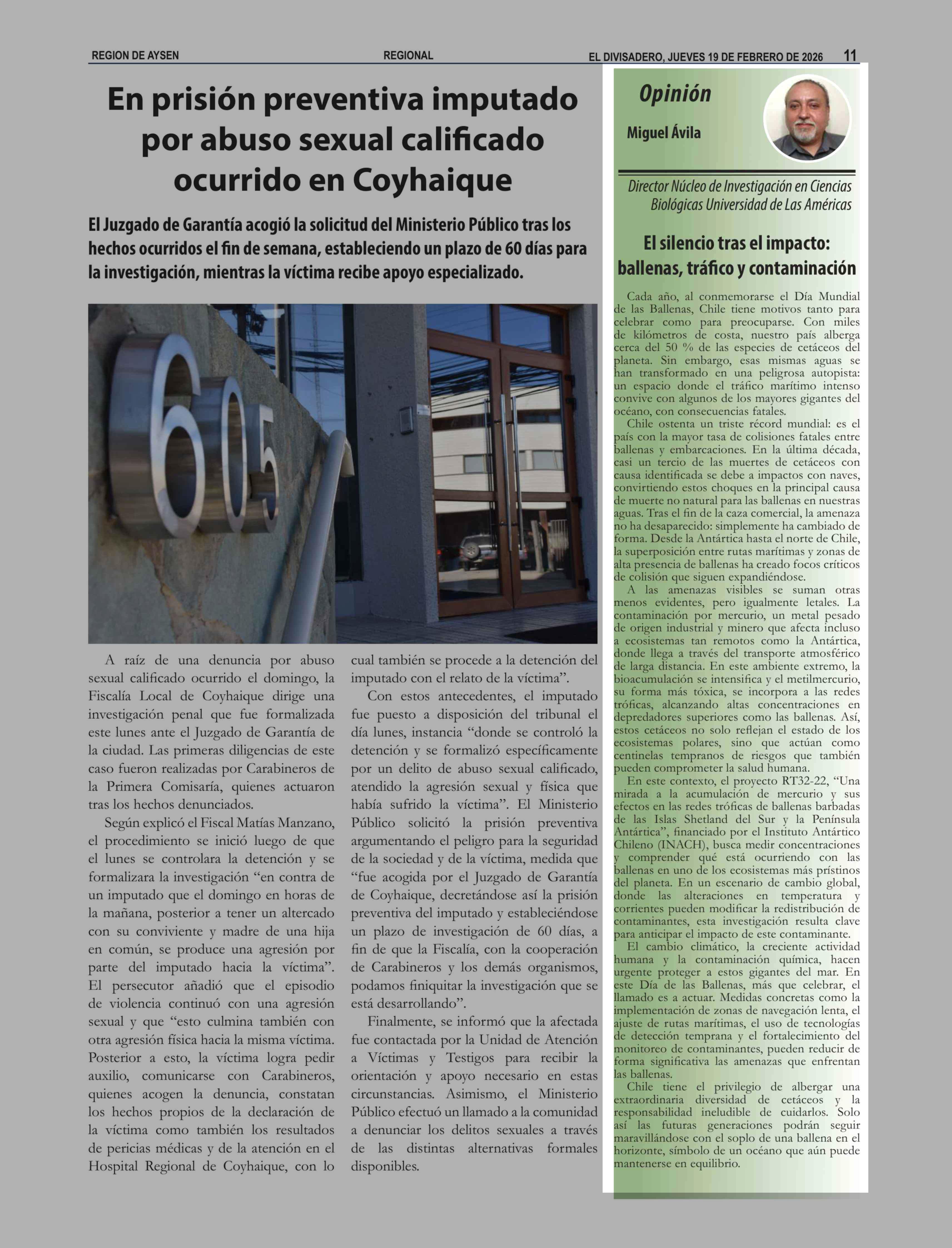 Columnas de Opinión: El silencio tras el impacto: ballenas, tráfico y contaminación 19-02-2026 El Divisadero |