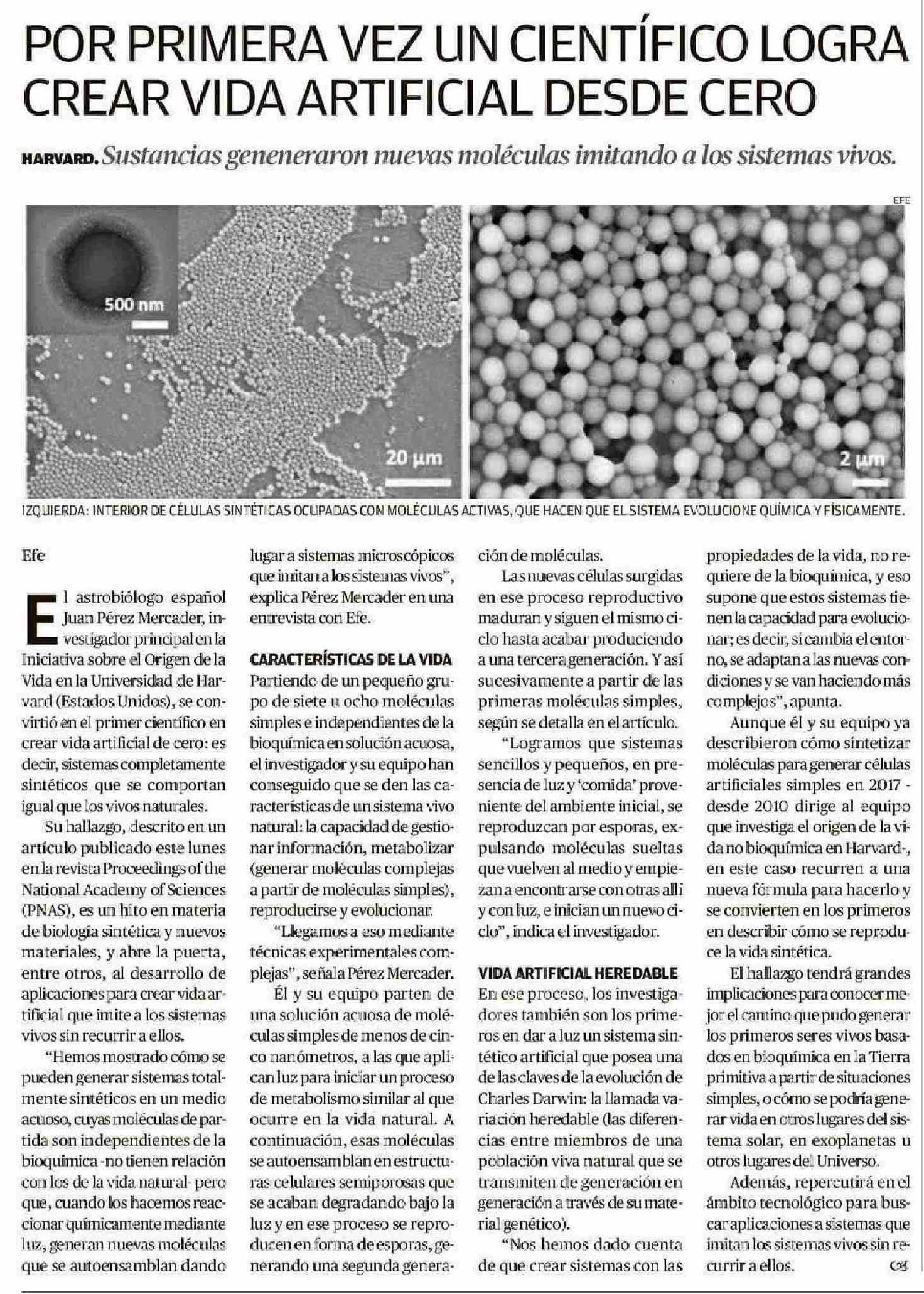 POR PRIMERA VEZ UN CIENTÍFICO LOGRA CREAR VIDA ARTIFICIAL DESDE CERO 27-05-2025 El Austral de Osorno |