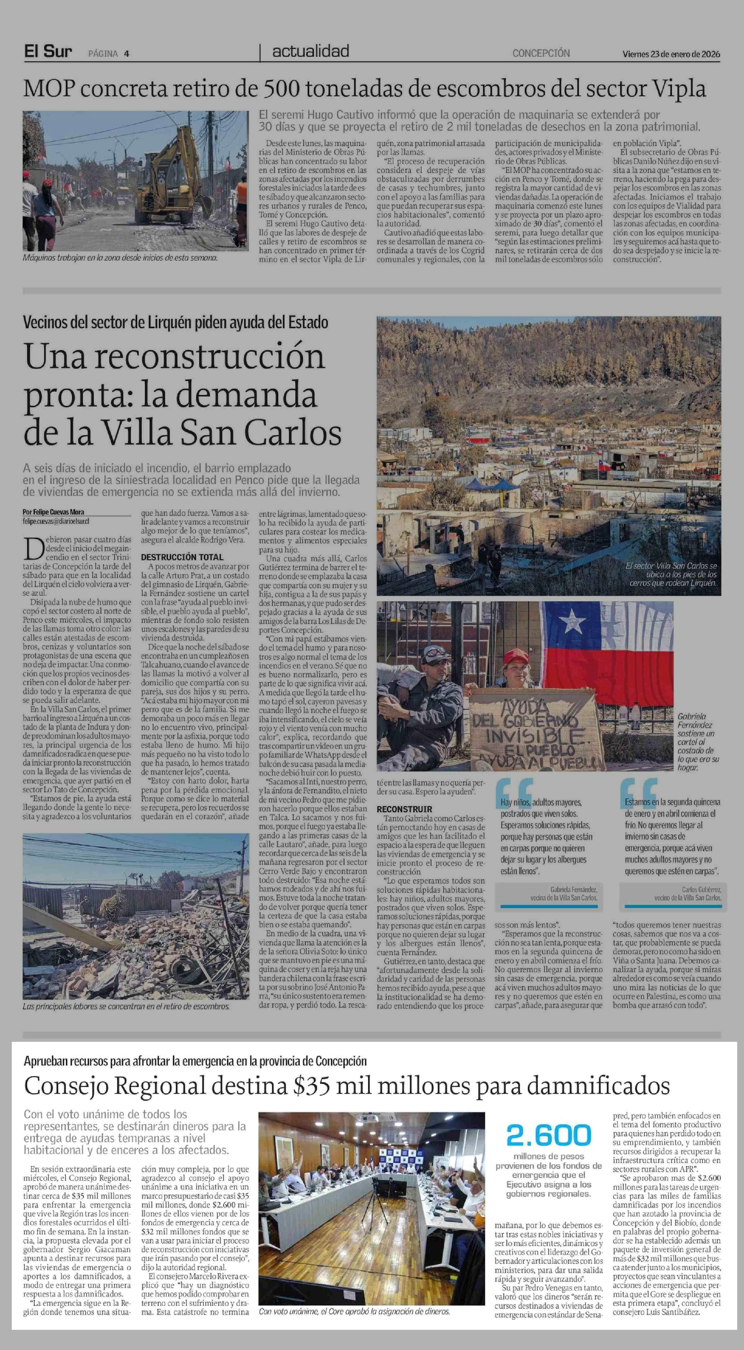 Consejo Regional destina $35 mil millones para damnificados 23-01-2026 El Sur |