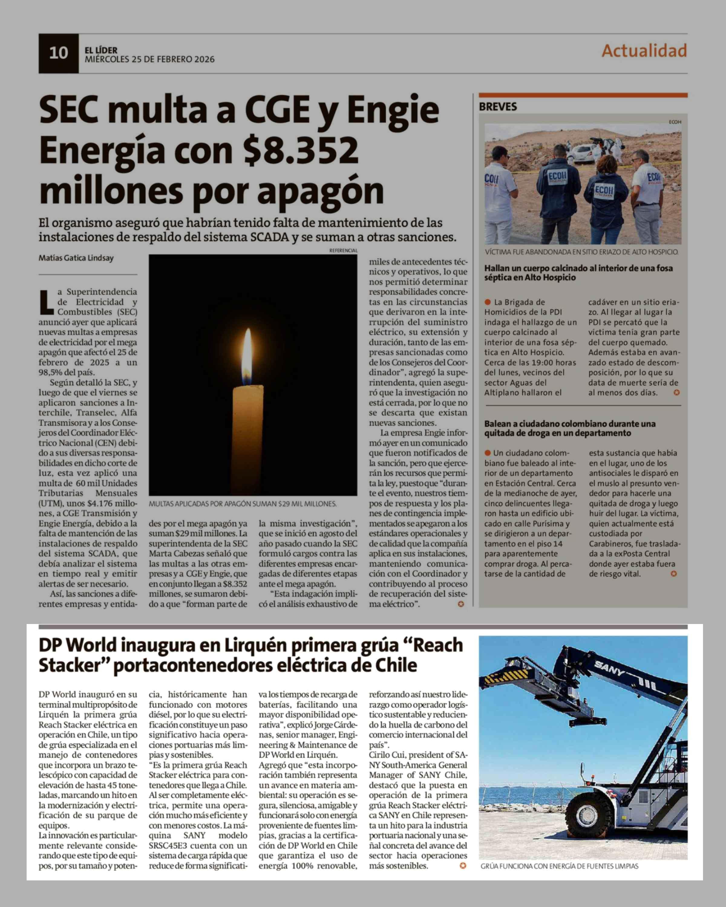 DP World inaugura en Lirquén primera grúa "Reach Stacker" portacontenedores eléctrica de Chile 25-02-2026 El Líder |