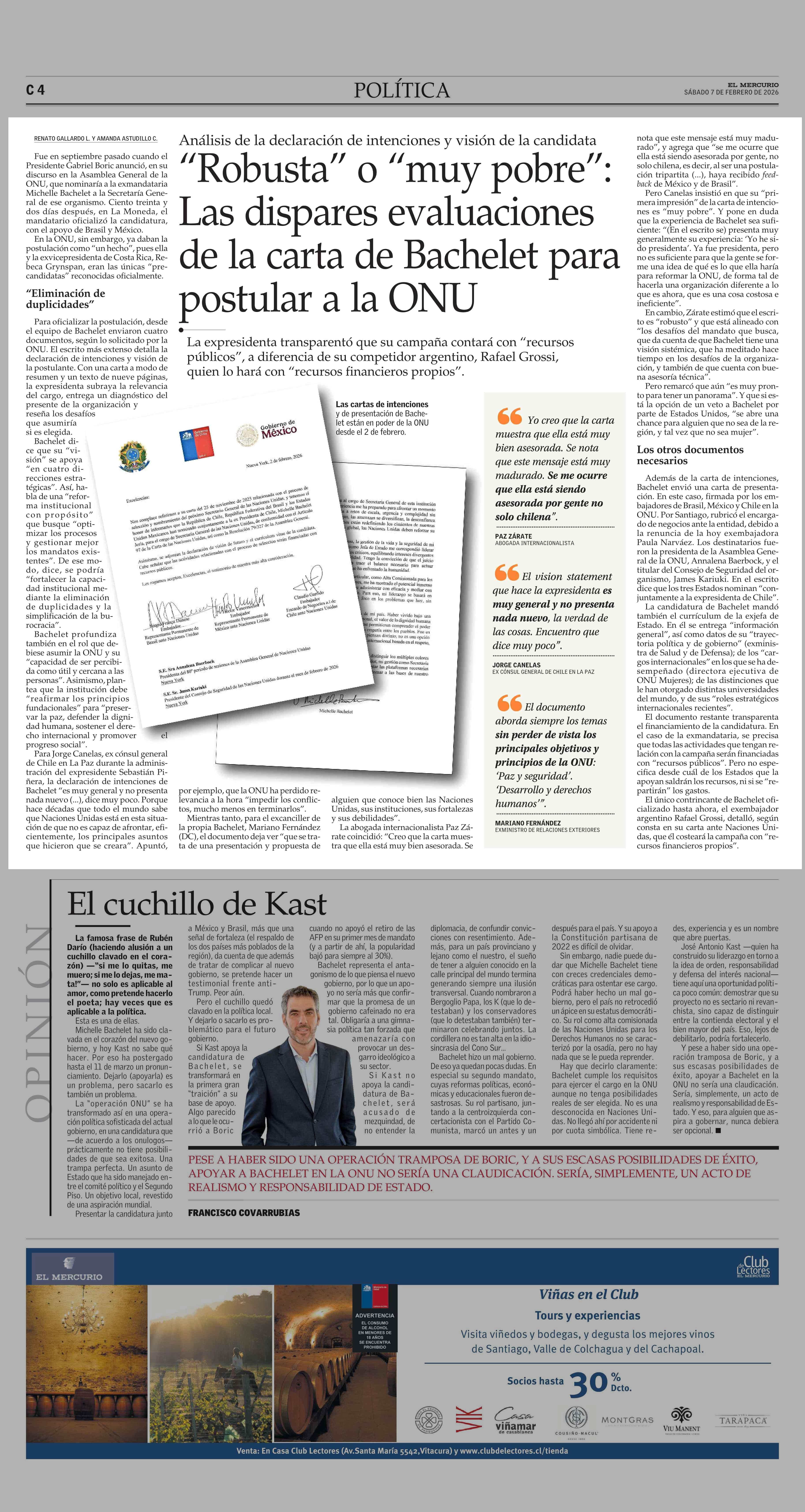 "Robusta" o "muy pobre": Las dispares evaluaciones de la carta de Bachelet para postular a la ONU 07-02-2026 El Mercurio |